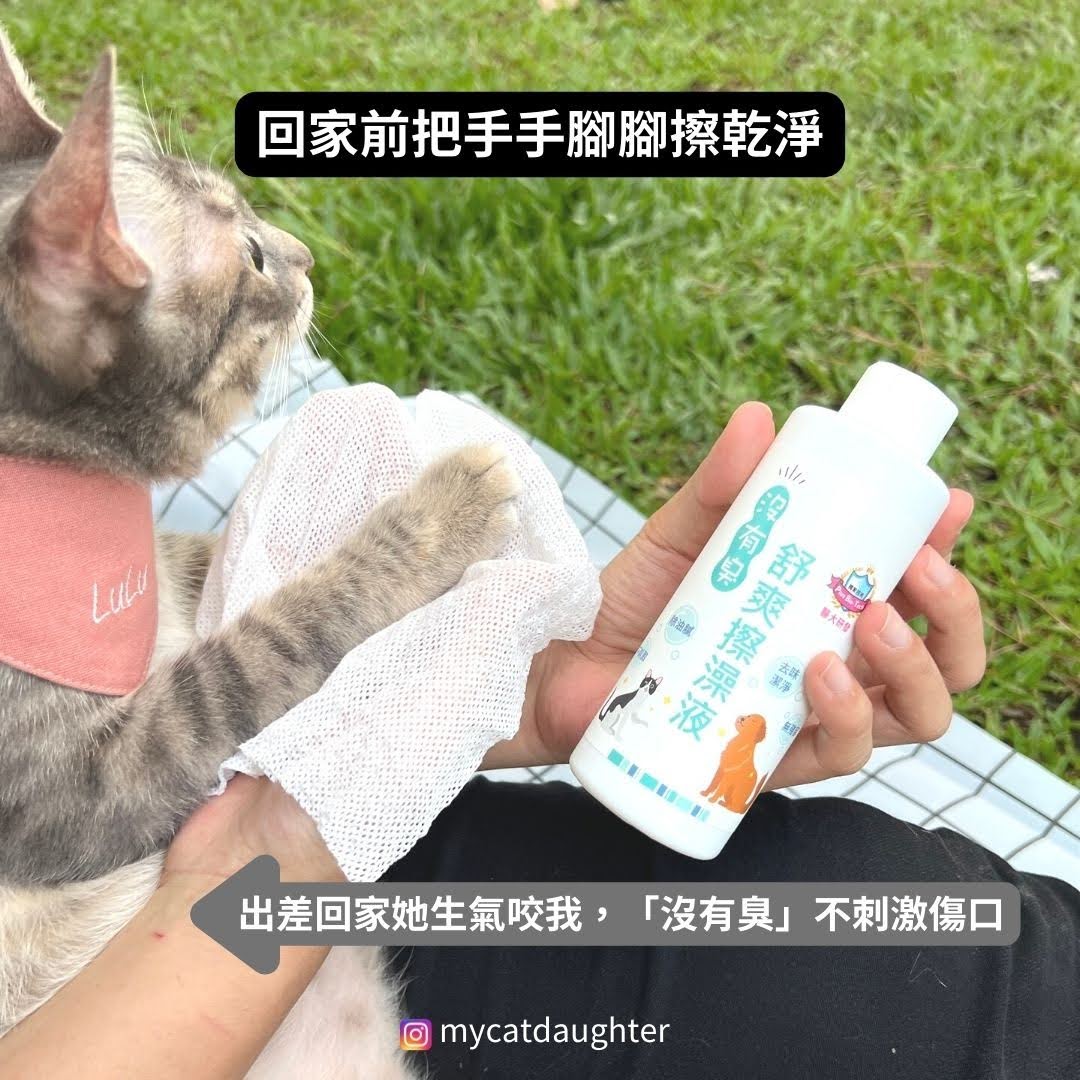 全身髒兮兮的她到攝影棚吃飯,總是留下黑黑的足跡,我每次都用寵物專用濕紙巾幫她擦拭;才清潔完LuLu就開始一直舔毛,但濕紙巾大多數都使用添加物,讓產品保濕不發霉,長時間被LuLu舔下肚可能會影響健康,條紋共和國 @chicclubtw 邀請我們試試他們的寵物清潔產品「沒有臭系列」,其中有一瓶✨「舒爽擦澡液」✨是配合紙毛巾使用,將適量的舒爽擦澡液倒在紙毛巾上,即可幫毛孩擦澡;擦澡液的成分單純,只有電解離子水(去油)+果實丹寧(去味),用起來也安心;最近常常假日出差,已經超過一個月沒有幫LuLu洗澡了,還好可以用擦澡的方式取代洗澡,緩解我的過敏情況。💕