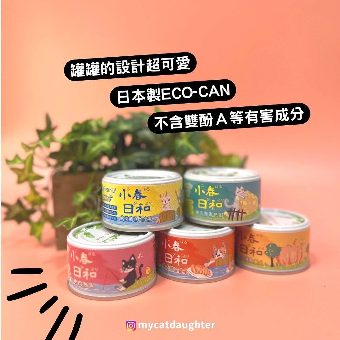 小春日和(こはるびより)一代主食罐包裝的插畫貼近品牌精神,暖色系的背景,每個罐罐都有不同小貓咪,可愛的手繪風格,讓我們感受到平日傲嬌的主子們帶給我們溫暖與陪伴,不只是插畫可愛,罐體本身是日本🇯🇵新日鐵公司生產的ECO-CAN,專利「批覆材料」獲得日本綠能標章 ECO-Leaf ,ISO14025;工廠生產時減少碳排放,降低生態負擔,產品不含雙酚A及其他三聚氫氨、塑化劑等對人及毛孩有害的成分,家長安心才能讓毛孩吃得更健康。