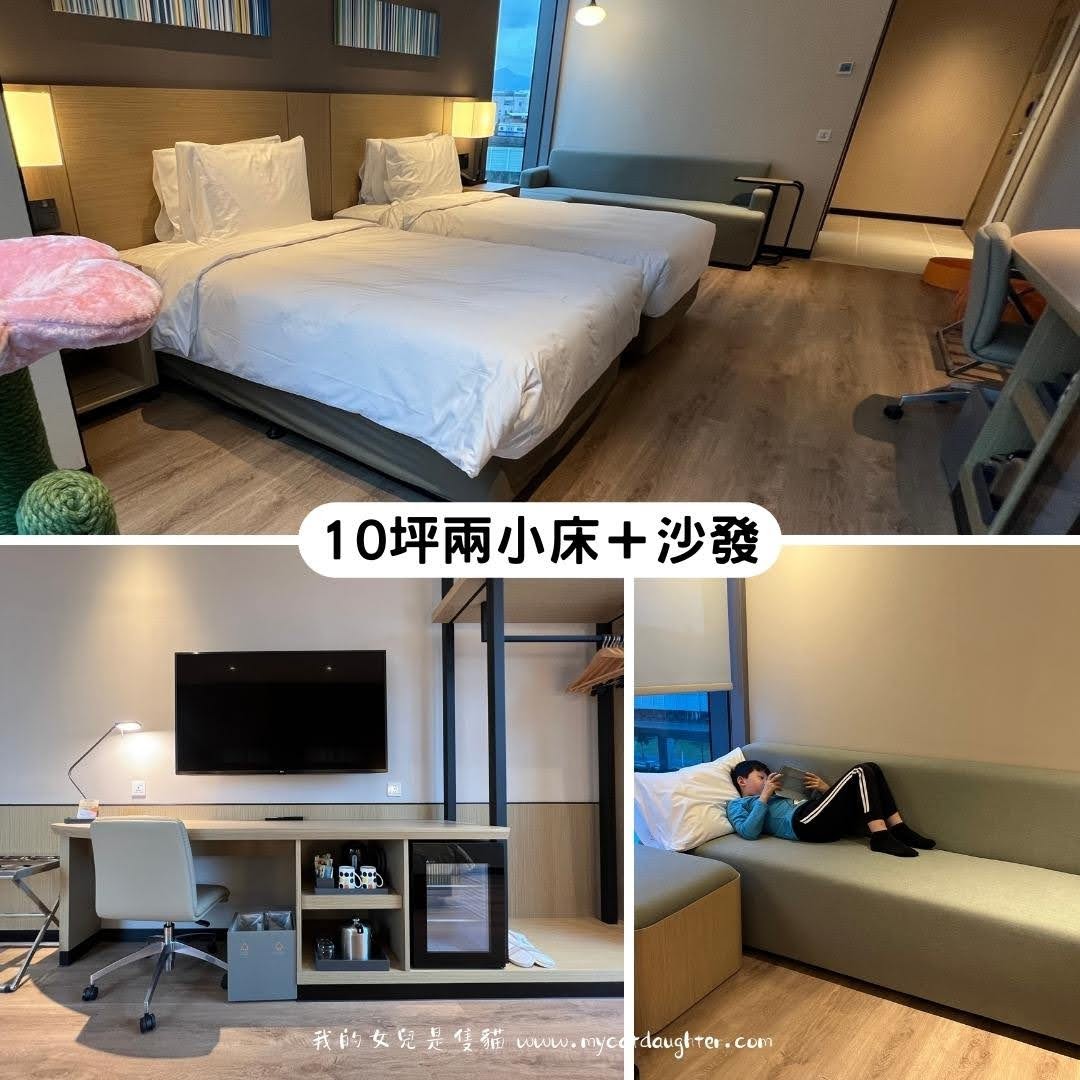 這次我們兩大兩小+一貓入住六樓的豪華房型10坪大,兩張120*200的小床,四顆枕頭兩條棉被,附帶一套沙發。