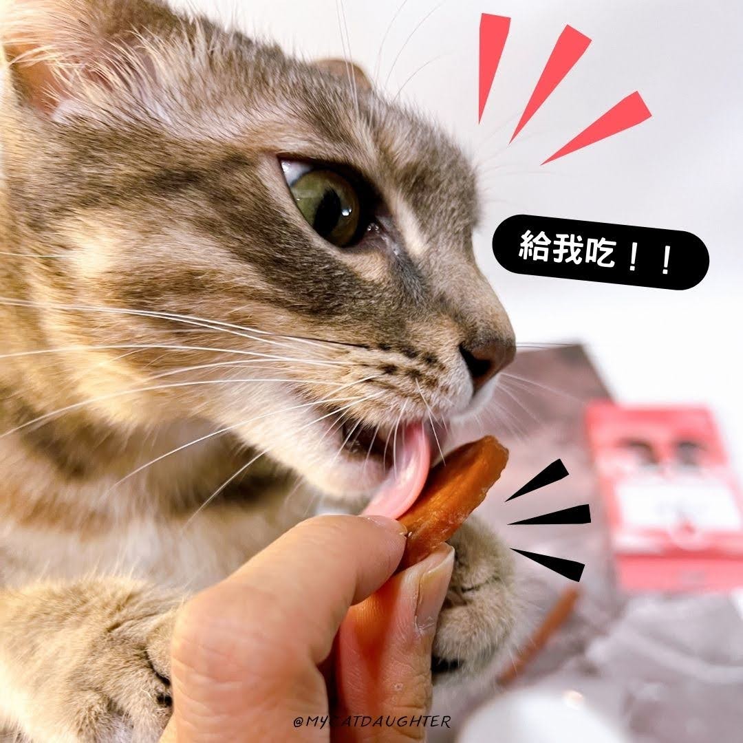 諾麗果羊丁、卵磷脂牛餅、蔓越莓雞筷三種口味,包裝很嚴實,沒拆封LuLu聞不到味道,一開封饞貓就衝過來搶食,我都來還不及剪成小塊,就被她舔的手都是口水😸,我還是捏很緊不給她吃,因為卵磷脂牛餅、蔓越莓雞筷剪成小塊給貓咪食用比較安全,不然像這種猴急的小寶貝,看到好吃的零食就狼吞虎嚥一口吞下去會噎到喔!