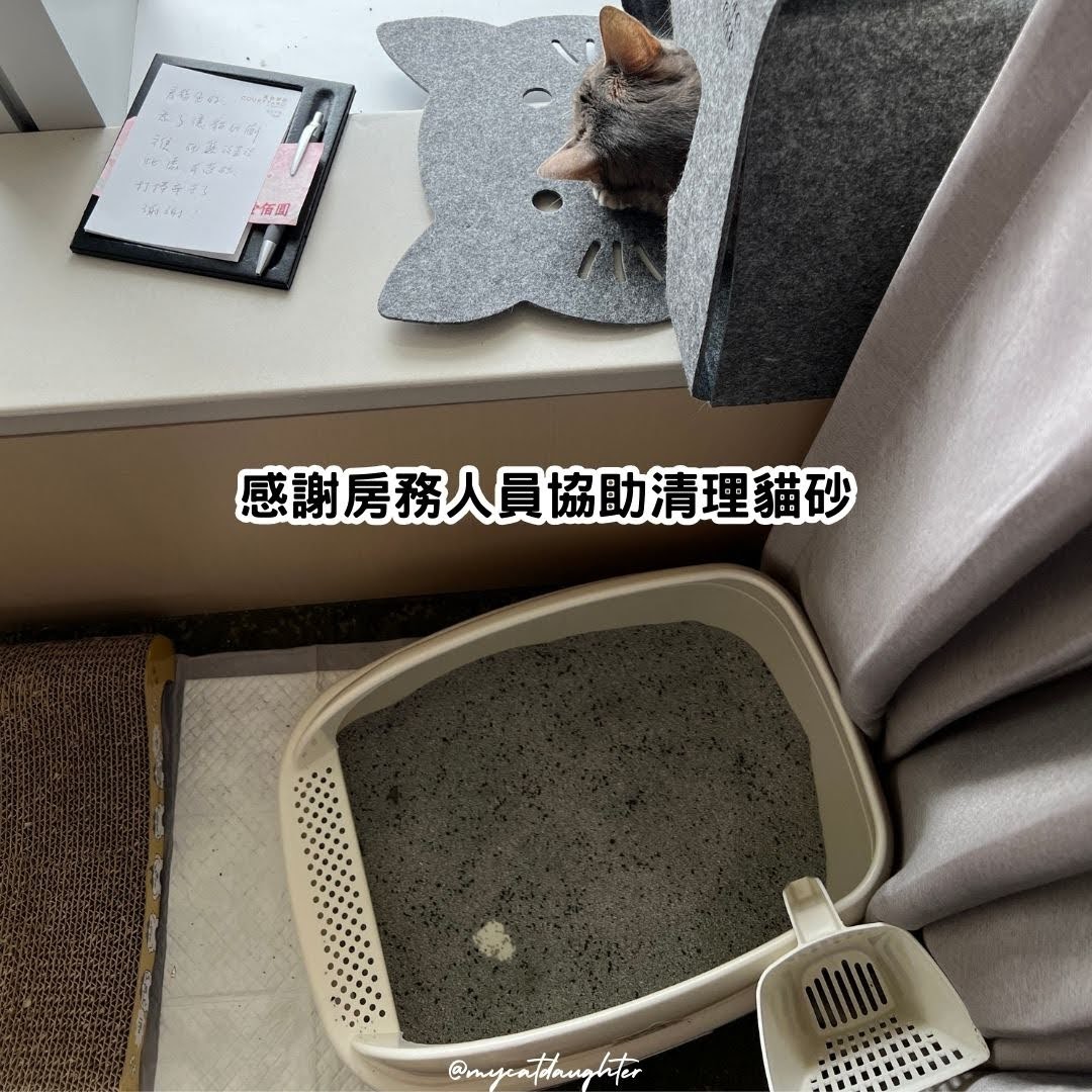 LuLu走過來看一看又走了,我看一下砂盆內緣深色污漬還在,體恤下午是房務人員極為忙碌的時段,我就拿著自備的寵物用品「掰了味+臭味滾濕紙巾」親手擦拭乾淨,LuLu大小姐看我忙完,果然立馬來上廁所…