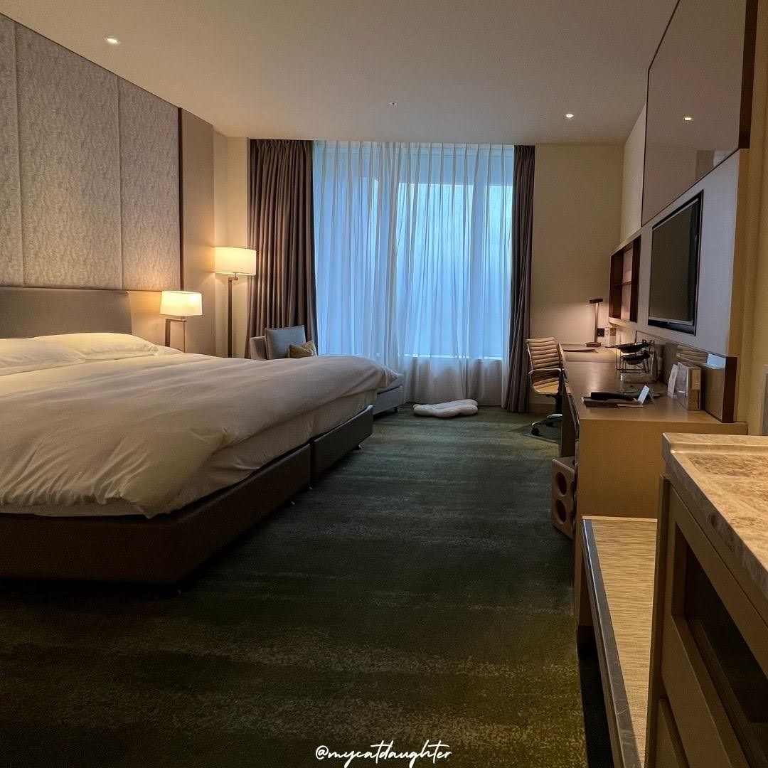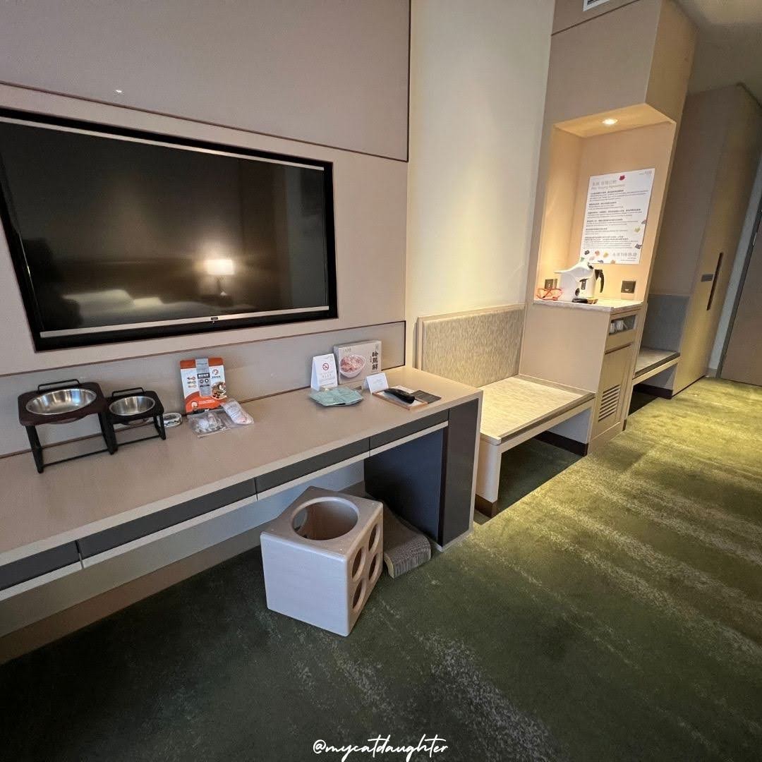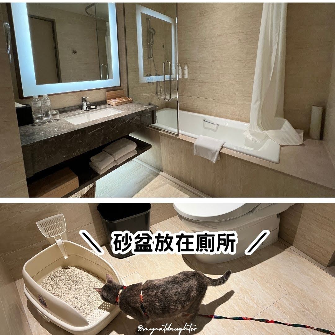 寵物樓層在15樓,當天只有看到我們那間房有掛貓咪在房間牌子,一進門果然跟其他樓層一樣是地毯,是有床底的四腳床架,我立馬繃緊神經,格外注意貓咪上廁所以及鑽床底的問題。