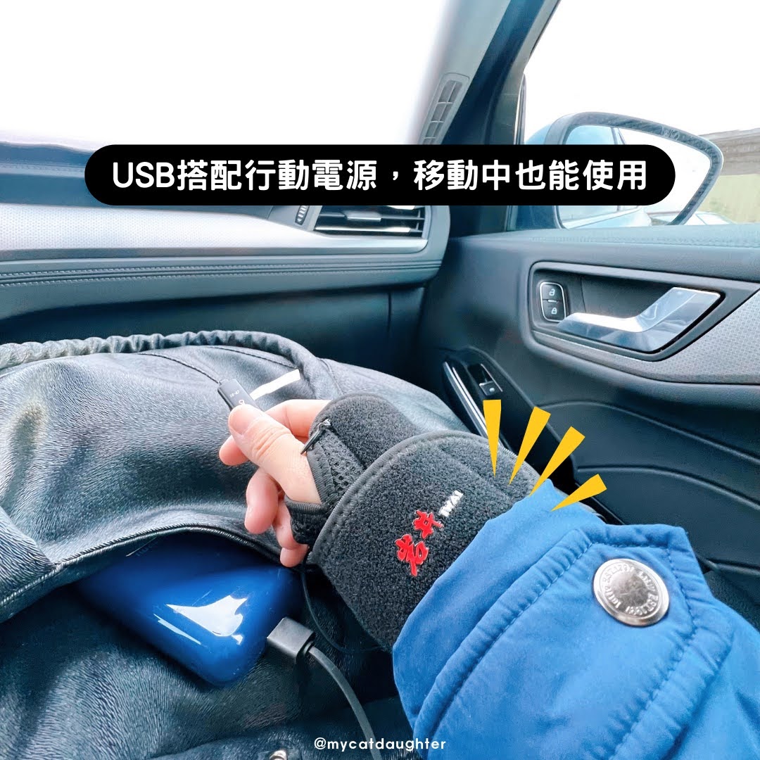 USB充電設計,我插著行動電源也可以戶外使用,某天我戴著護腕,騎機車到學校接小葛格,他摸摸我的手問:「媽咪,我手好冷喔,妳的手為什麼那麼暖?」從此以後我更加勤快用石墨烯護腕了。