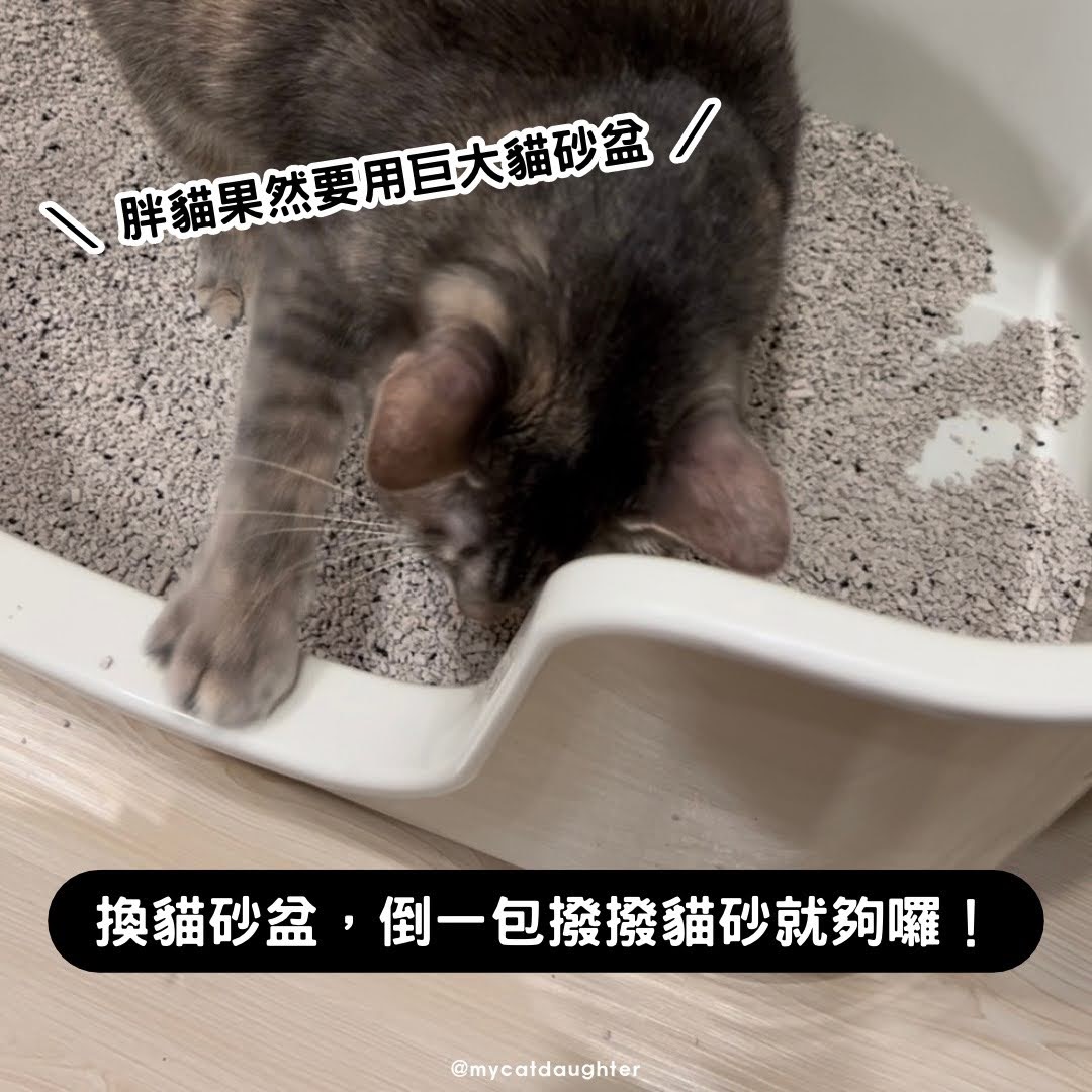 第四週我換了巨無霸貓砂盆,通常到兩包才夠厚的盆子,我只倒了一包唷!這次正確了✅,LuLu還是愛東撥撥西撥撥(土撥鼠膩?),但沒有撥出來囉!每次上廁所還是會有少量的砂卡在胖LuLu腳掌帶出來,我覺得很正常唷。