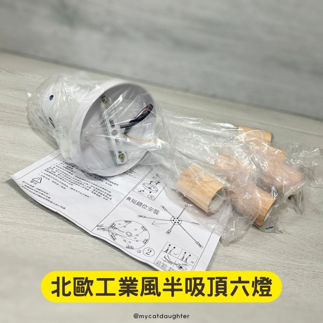 評估過小坪數房間,跟天花板的距離近,因此決定還是選擇吸頂燈,葛格說想要工業風,我找了「北歐工業風半吸頂六燈-KC2368」給他們看。
