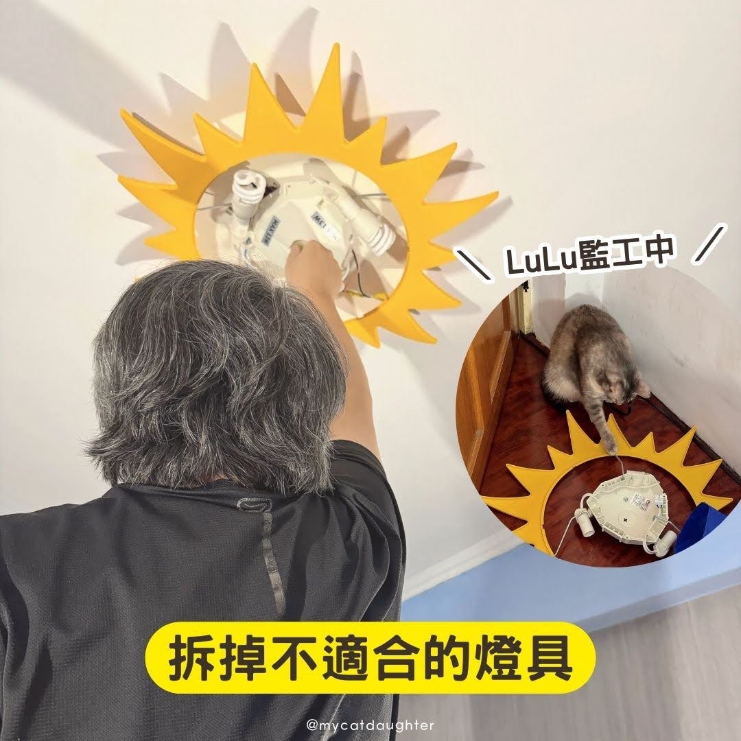貼完深色壁紙覺得書房有點暗,房間太暗會妨礙他們閱讀寫作業,立馬決定要把不合時宜的太陽造型吸頂燈換掉。