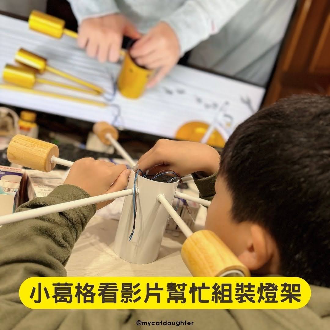 麻麻跟小葛格去書房看教學裝燈架與燈泡,LuLu一直很好奇跑來監工,我們弄好以後拿燈架給拔拔安裝。突然發現拔拔面有難色地走下梯子…