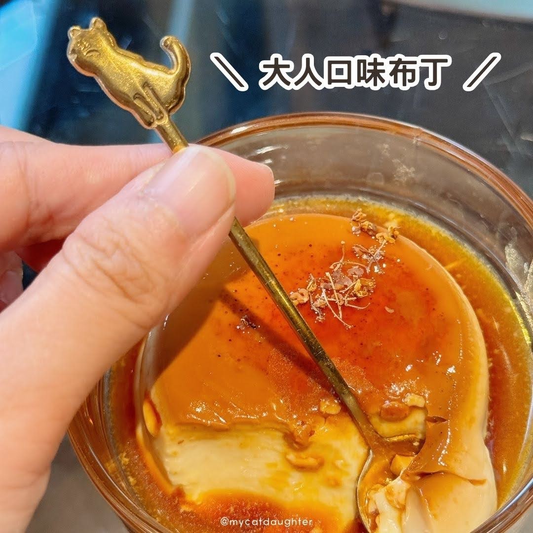 輪到吃甜點了!號稱吃甜點有另外一個胃的我本人,首先品嚐點綴桂花搭配貓咪湯匙好有質感的大人口味布丁!布丁滑嫩香氣十足,小葛格說他只能吃一小口,肚子太飽要走走休息一下,我就不客氣嗑光光囉!
