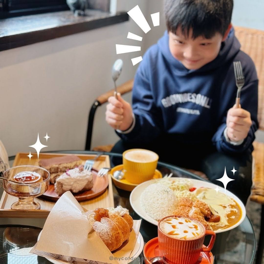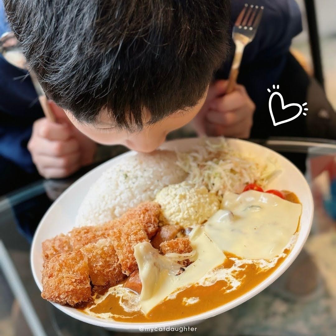 從小到大去過很多親子餐廳,這種餐廳的餐點通常很普通;這是他第一次體驗貓咪餐廳,這裡餐點現點現做,一點都不含糊,咖哩豬排的份量很大又加了起司,他吃得很過癮。