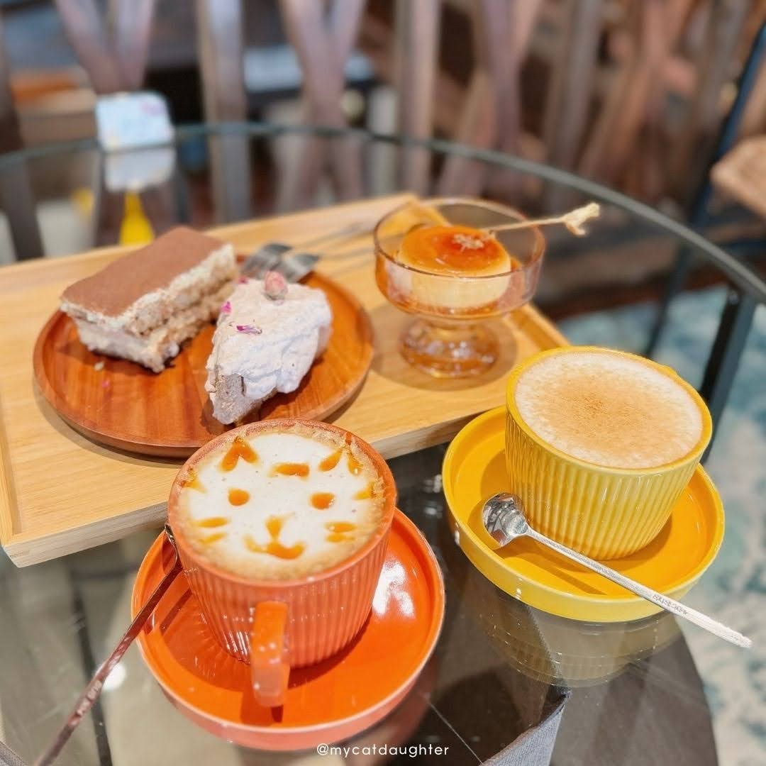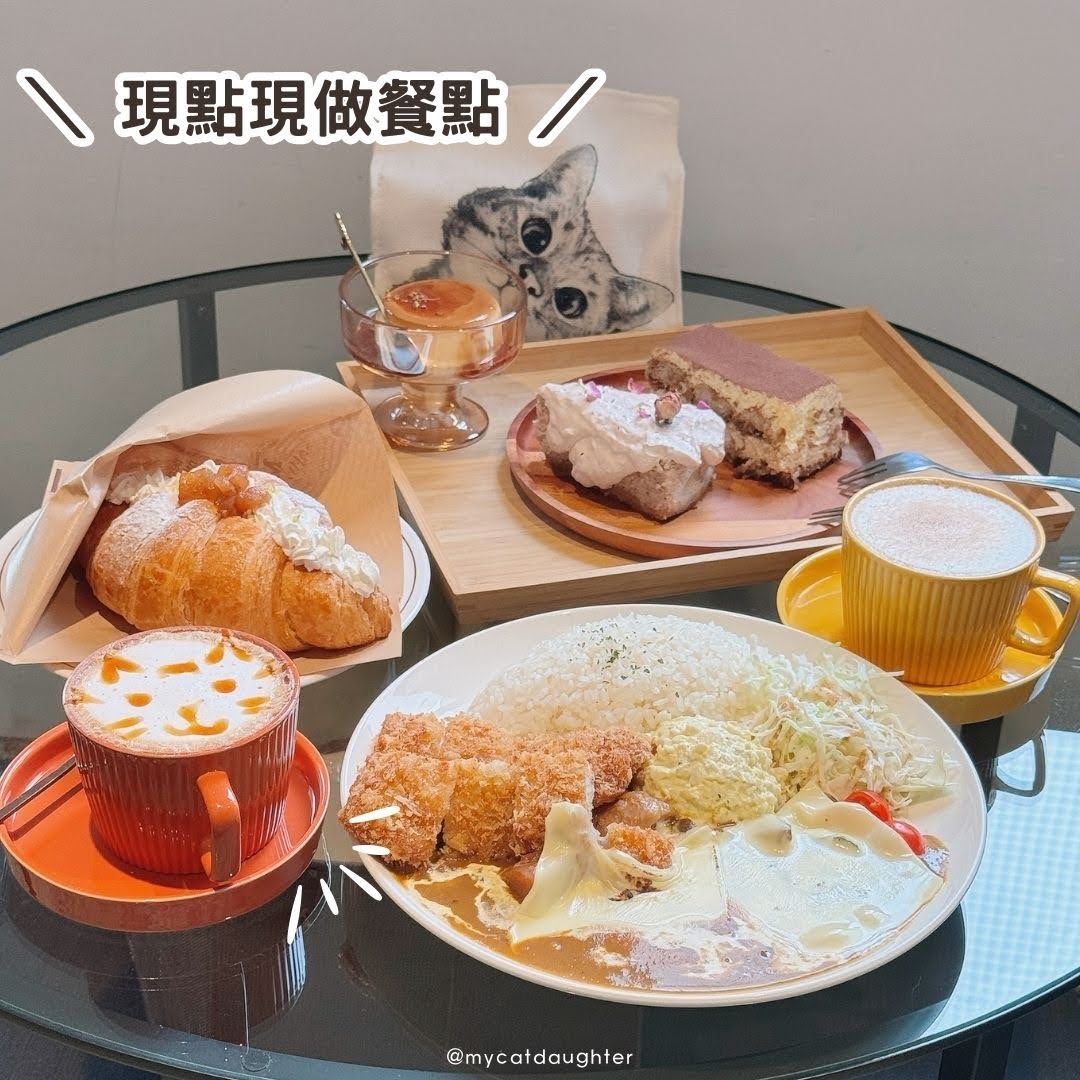 男孩長大都是真吃貨!他點了最愛的咖哩炸豬排+起司,搭配黑糖鮮奶茶,我則是點了蘋果肉桂可頌搭配海鹽焦糖瑪其朵;甜點則是點了招財拼盤(大人味布丁、兩個蛋糕請店員隨機配)