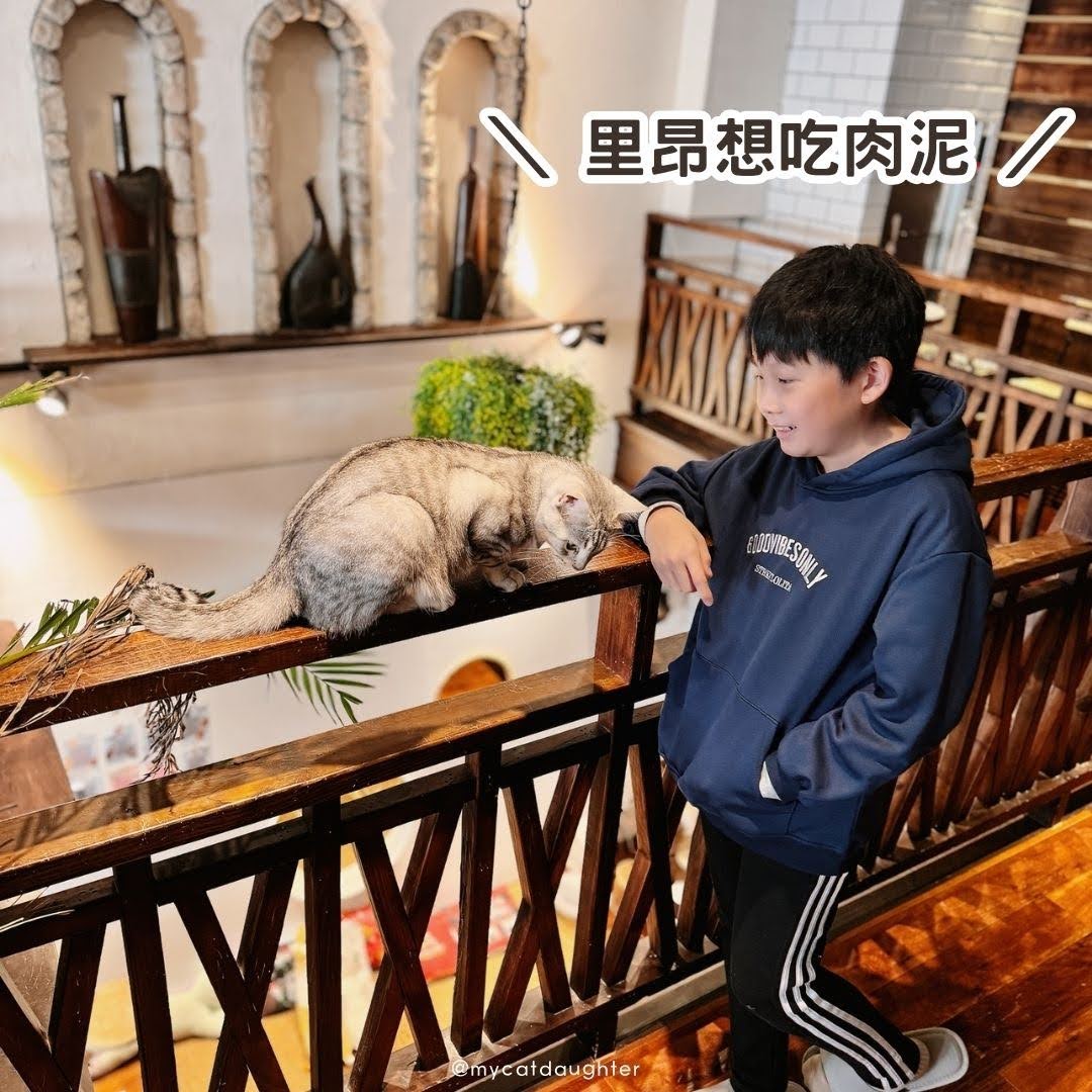 餐點現點現做,這天人比較多,我們趁等待的時間先去跟貓互動,緬因貓招財超級親人,我們兩個都差點被他收買了,不過小葛格還是很冷靜告訴我,他愛LuLu多一點。跟貓玩很容易忘記時間,餐點搭電梯送到三樓囉!可愛又熱情的店員幫我們佈餐。
