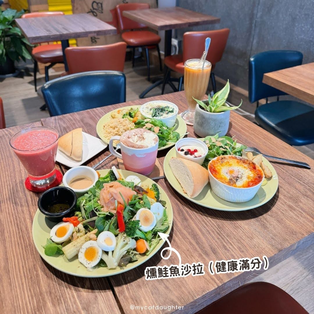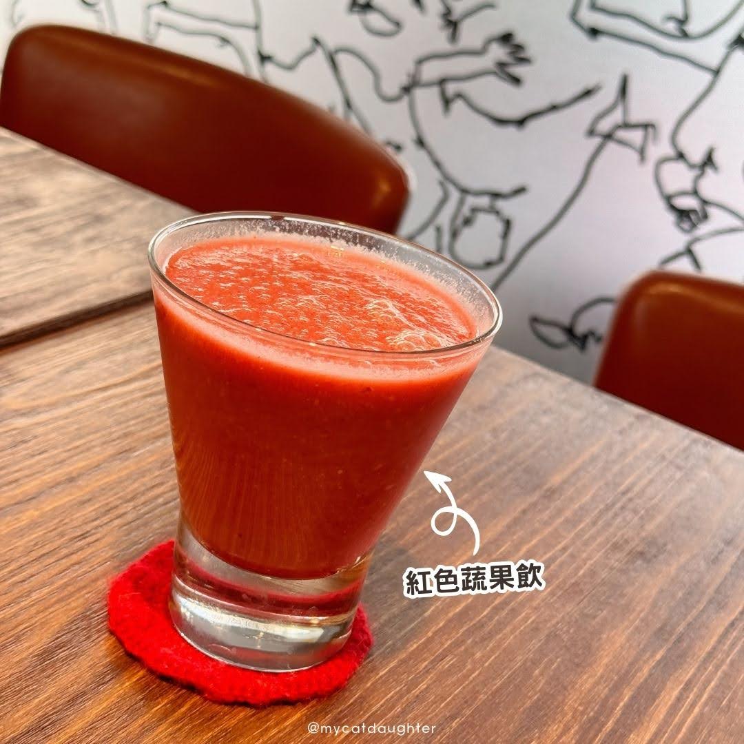 選擇在這裡用餐主要是因為這裡寵物友善,還有拔拔最近在飲食控制,只能吃蛋白質跟蔬菜,跳舞蘭咖啡餐點都會搭配三分之一盤以上的芝麻葉等生菜再撒上杏仁片做成的沙拉,拔拔點的燻鮭魚沙拉套餐,有附贈麵包以及搭配任選一杯彩虹蔬果飲(紅、綠、橘、黑),拔拔選擇紅色蔬果飲,食材有:甜菜根、覆盆莓、柳橙、鳳梨、西瓜、腰果、紅腰豆,喝起來就是我們之前早上做的精力湯,超級健康。