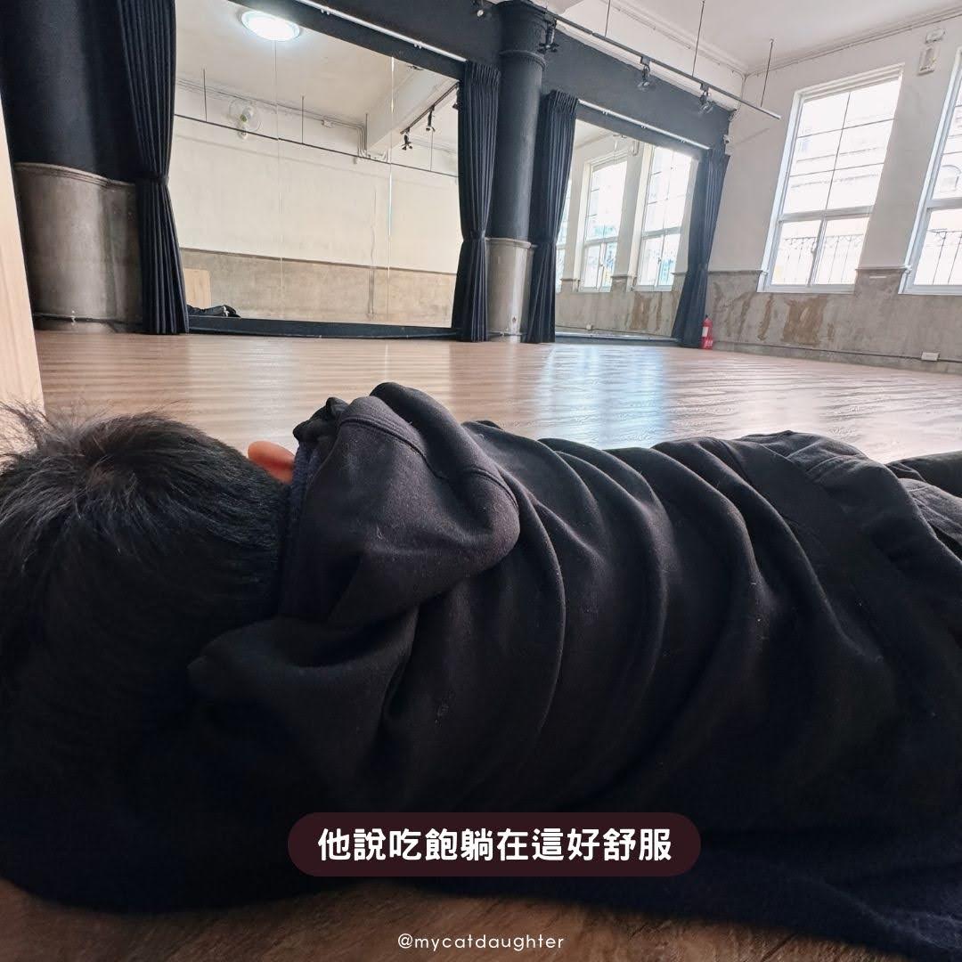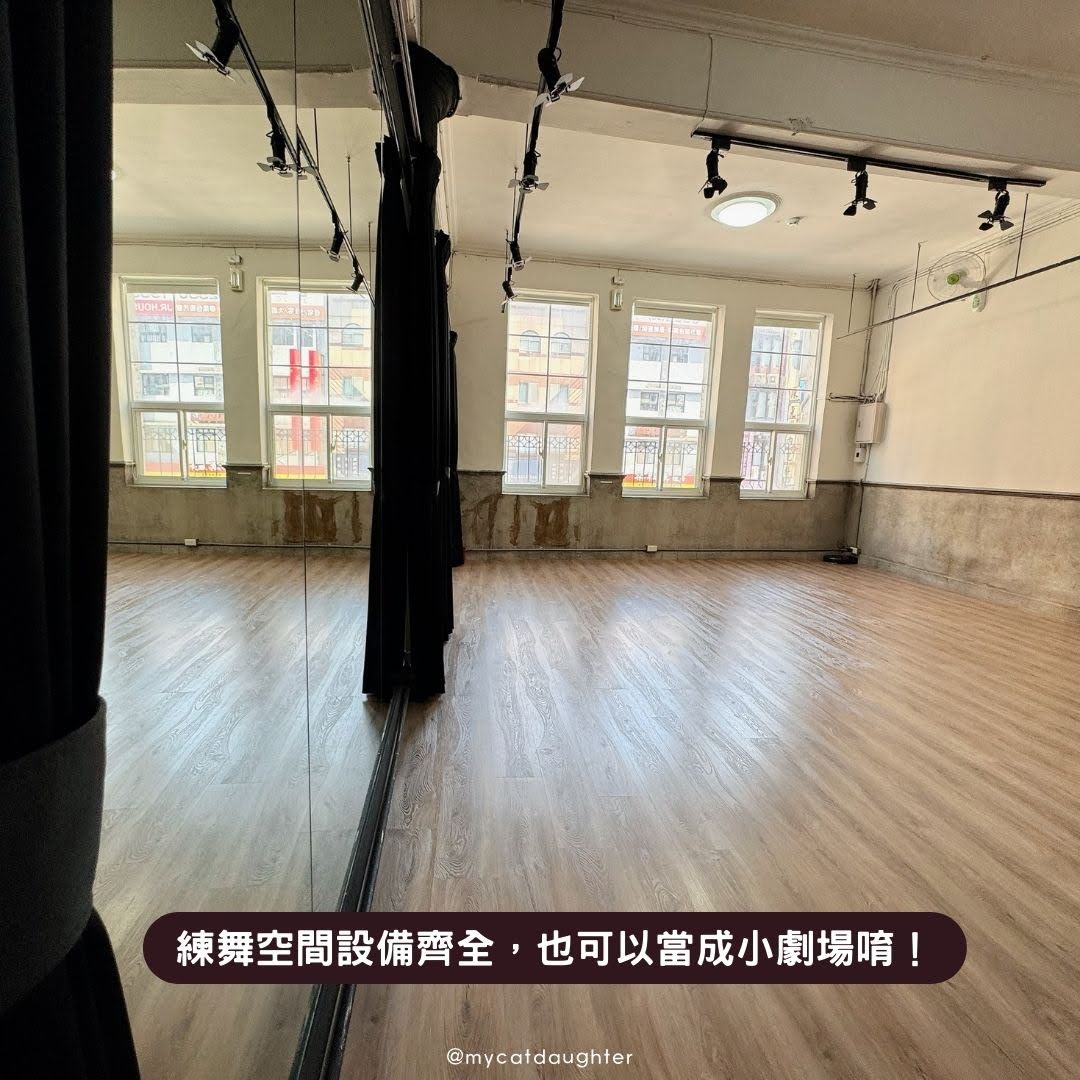 徵得店員的許可,踏著復古的石階我跟小葛格到了二樓(提醒大家上二樓要脫鞋子,寵物不可以上二樓),這棟具有80年歷史的大同區老房子,經過設計師精心的整修,保留老宅的柱子與牆壁,讓老屋帶著舊時光的韻味;另一側裝潢使用大面積的鏡子與黑色布簾,無論是練舞、劇場或是瑜伽場地都很適合,二樓的舞蹈場地設備完善,有音響燈光,還有配置淋浴設備唷!