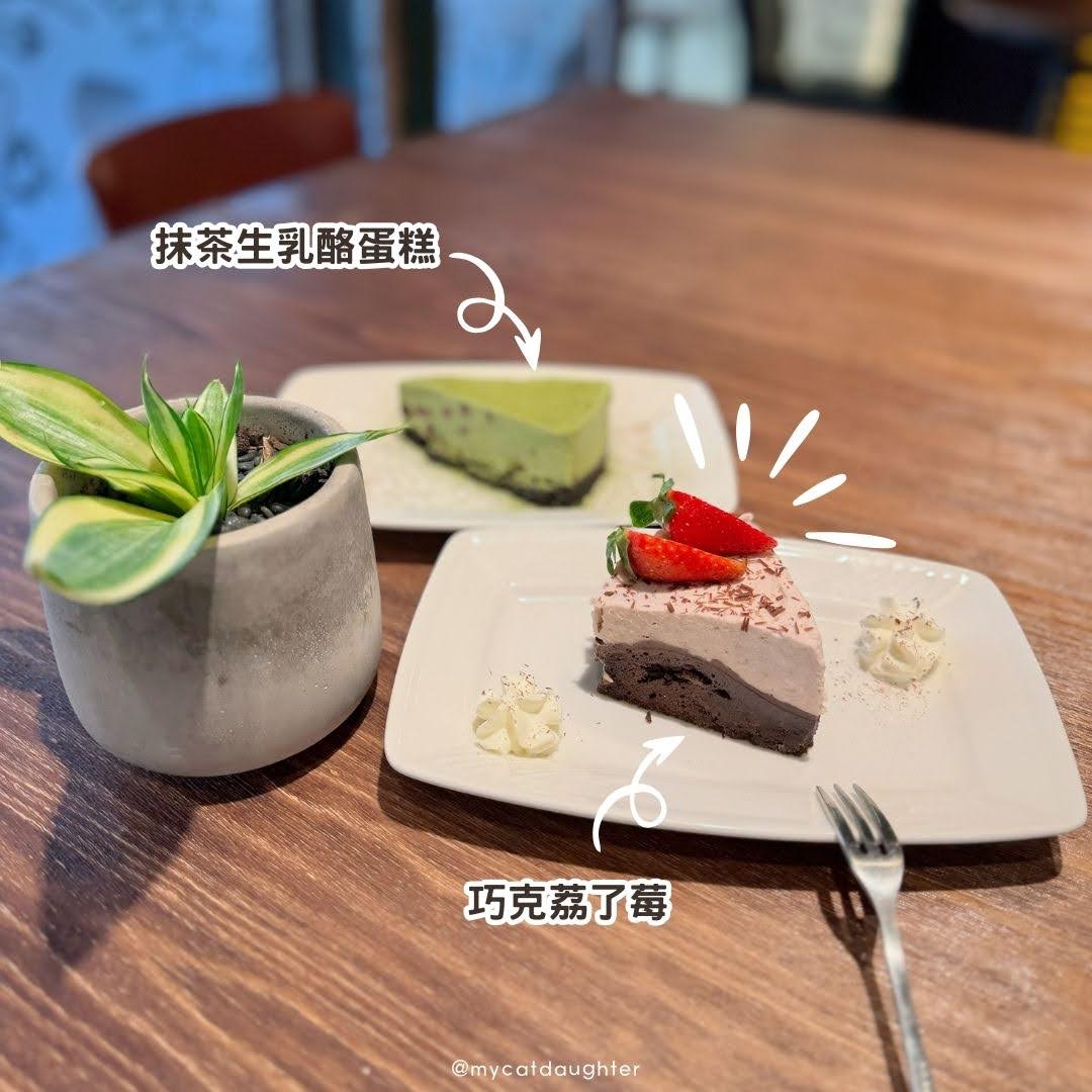 手作甜點蛋糕體品嚐起來屬於扎實的質地,草莓荔枝慕斯是清爽香甜的口感,抹茶生乳酪蛋糕香氣濃郁,以Oreo餅乾為底創新有趣,由於我們在樓上玩,甜點在樓下等我們一段時間,店員有說在室溫下吃起來會比冰凍時甜一些,下次來這裡吃甜點搭配手沖咖啡一定更棒!