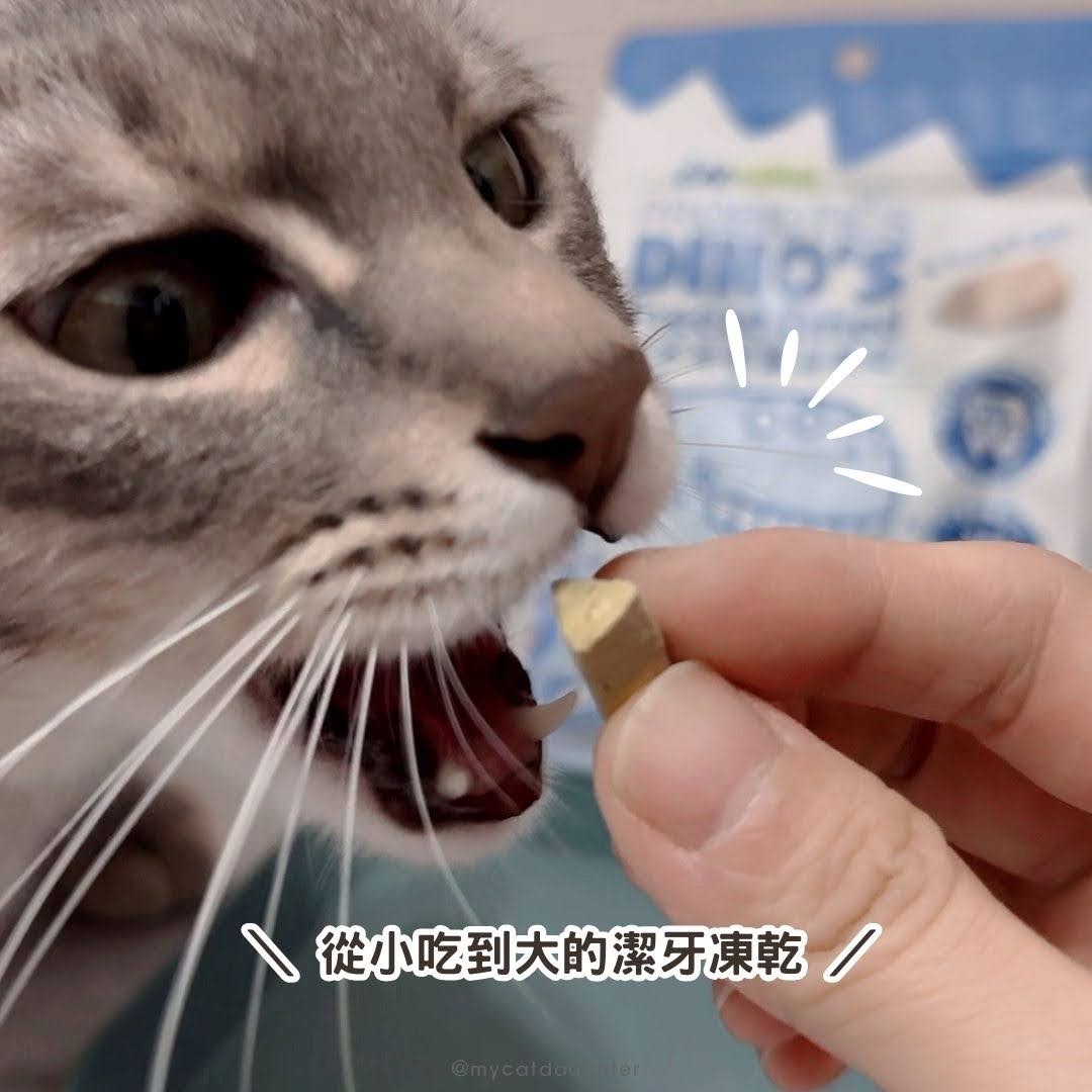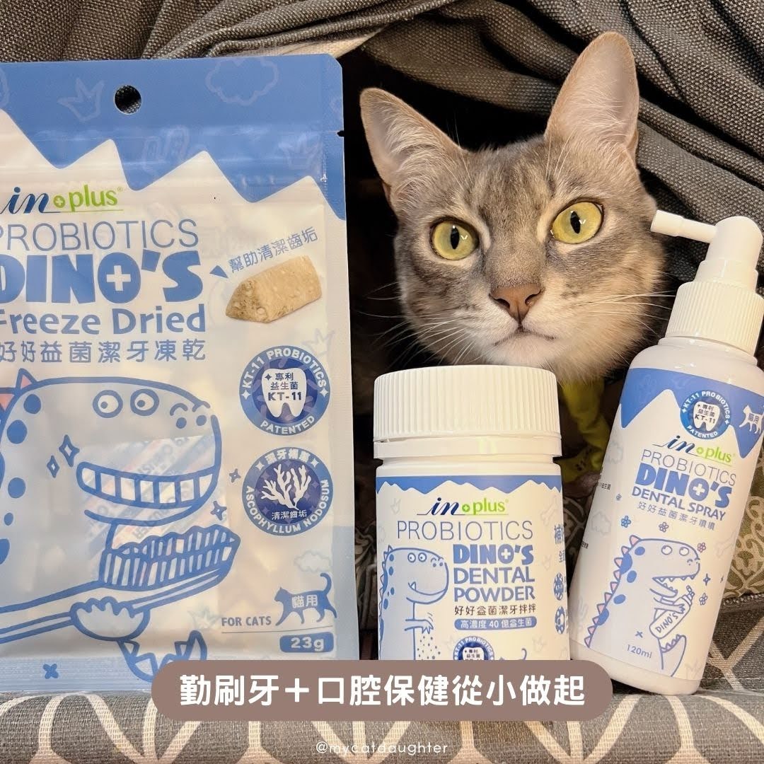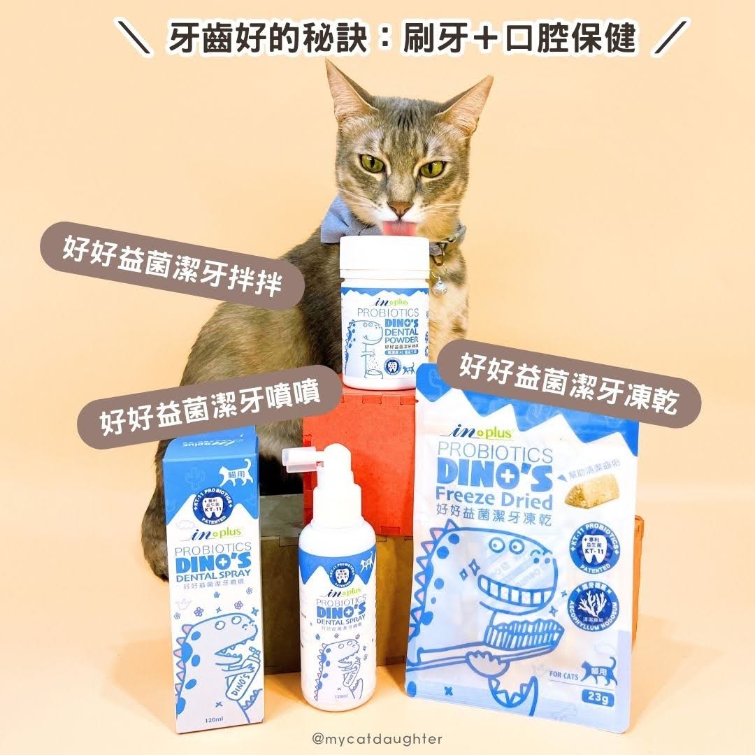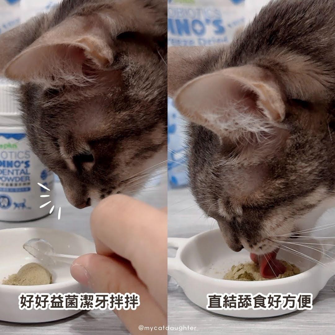 LuLu吃完肉泥比較不會主動去喝水,要是沒有幫她擦擦牙齒,任憑食物殘渣在口腔內滋生細菌,長時間下來就容易形成口臭以及蛀牙,有一次被她打呵欠的口臭熏到,我立馬拿出🦖好好益菌潔牙拌拌,她立刻走過來直接舔食精光,粉狀潔牙拌拌舔食完會去喝水,口中的氣味就在拌拌跟水的作用下,改善許多,刷牙加上一週讓她服用兩三次,輔助口腔恢復健康氣味,好清新!