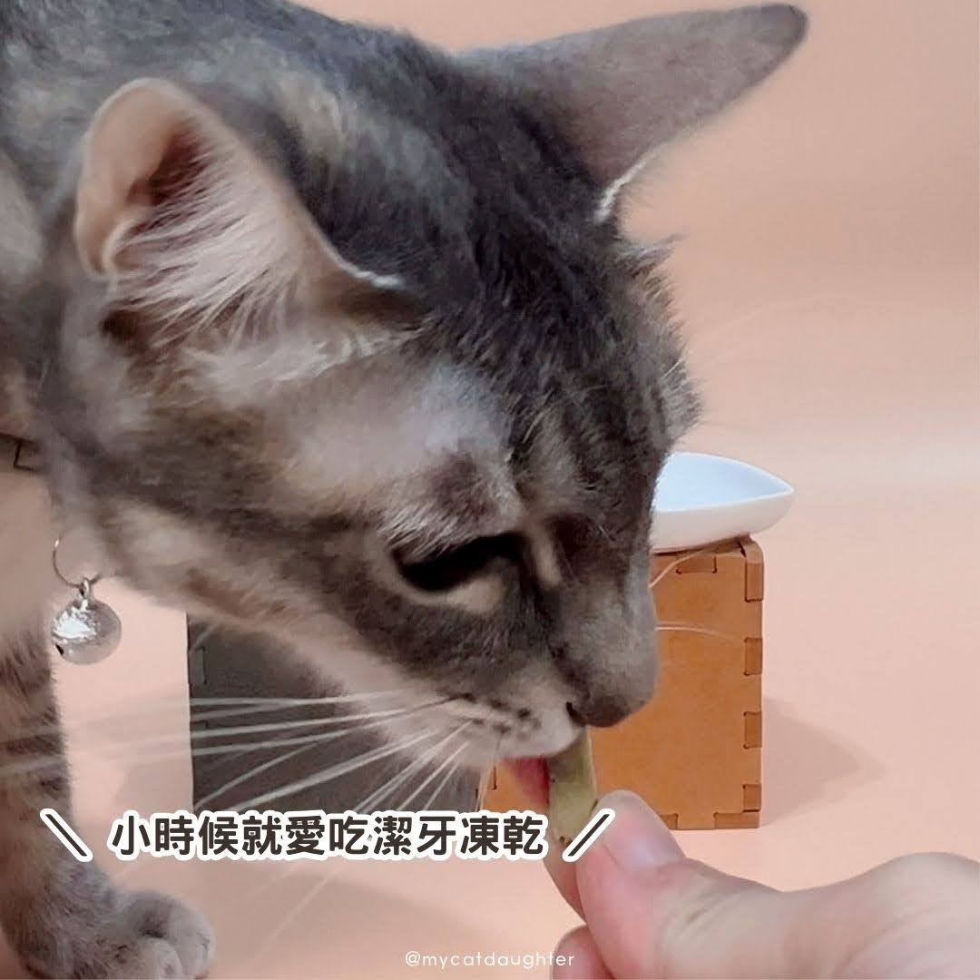 好好益菌潔牙凍乾適口性超高,LuLu一吃就愛!三角柱體形狀,讓她在啃咬的過程中清潔齒垢,黃黃齒垢除去了,牙齒就自然白白又亮晶晶!瞧她一口森冷的白牙,又尖又利又健康。