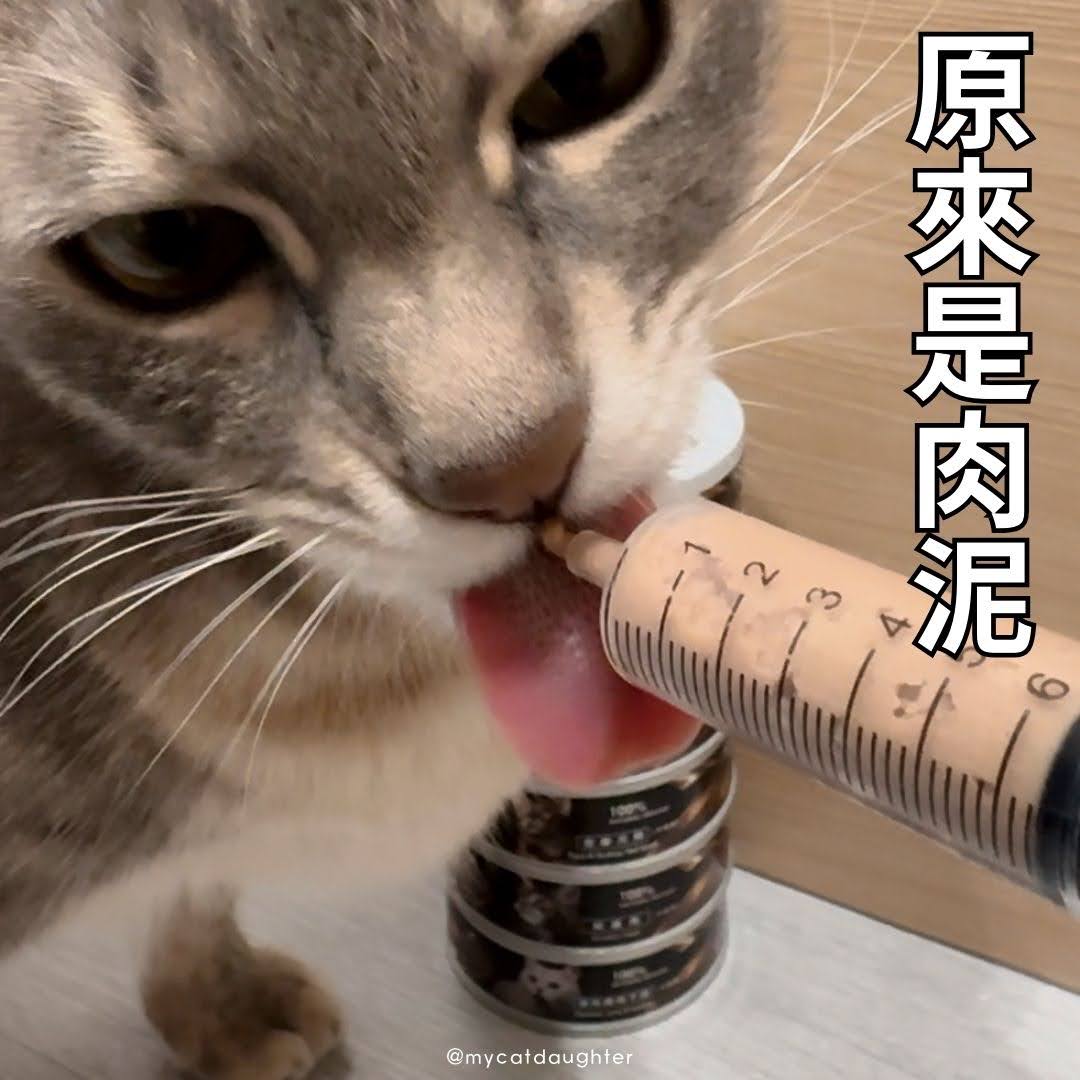 最後一罐「雞肉+牛肉」主角當然是雞肉、牛肉、雞肝,LuLu吃一吃我才想到「肉泥細緻可用針筒餵食或灌食」這件事。拿出之前LuLu生病時買的灌食針筒,肉泥果真能從灌食針筒順利擠出,這樣幼貓、老貓都可以食用了。