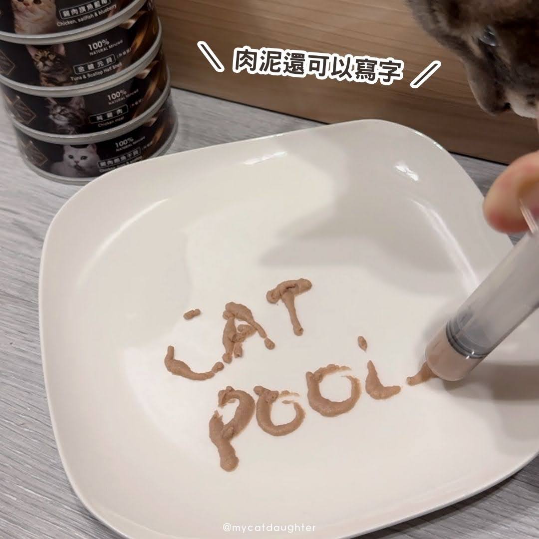 針筒裡還剩下一些肉泥,我試著擠光寫了一個catpool在盤子上,