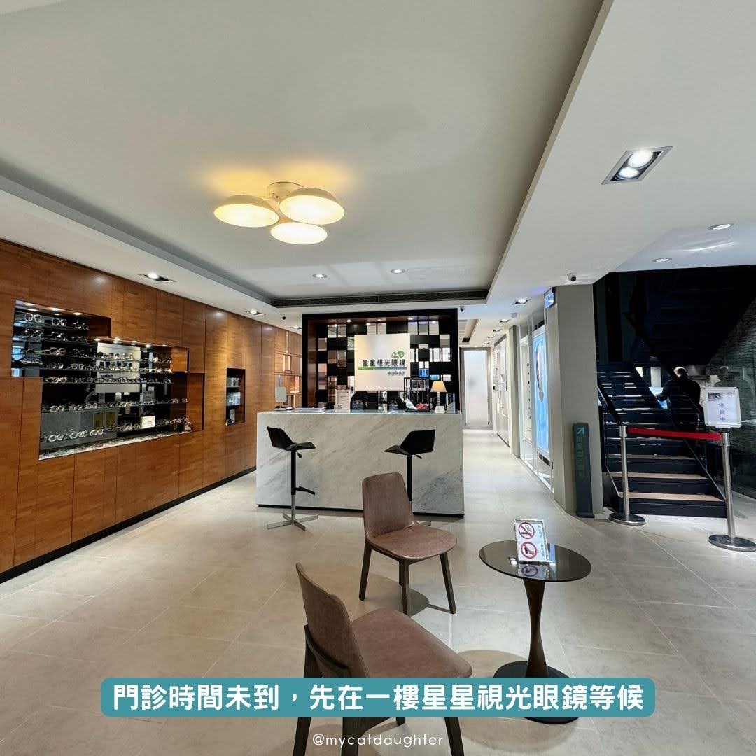 一樓是星星視光眼鏡,二樓是星星親子眼科;當天晚上沒有塞車,我們六點多就抵達星星親子眼科,診所還沒開門,晚上氣溫有點低,樓下星星視光眼鏡的員工看到我們在門口椅子坐著,還特別出來問我們是不是要看診,請我們到裡面沙發先坐著等,服務人員好貼心!陸續來了很多預約看診的人,都自動到一樓的星星視光眼鏡沙發區坐著,一下子大廳就塞滿滿了。