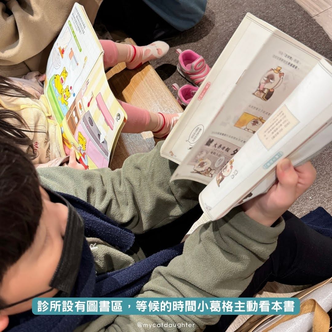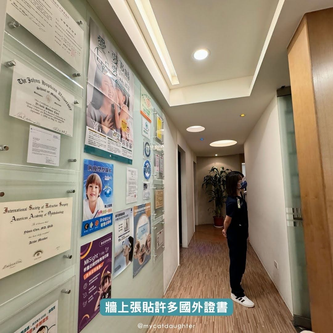 當天晚上是陳院長看診,多位驗光師及護理師忙進忙出在協助患者,先排隊報到填完初診資料,接著到等候區等待,等候區有許多書籍,小葛格找到一本跟貓有關的小說,在等候時閱讀津津有味,我看到牆上張貼許多國外證書,得知星星親子眼科還參加德國蔡司公司的近視管理系統臨床測試,這些精密儀器就安裝在一樓「星星視光眼鏡」,為使用者提供更好的近視管理解決方案、更棒的驗光配鏡體驗。