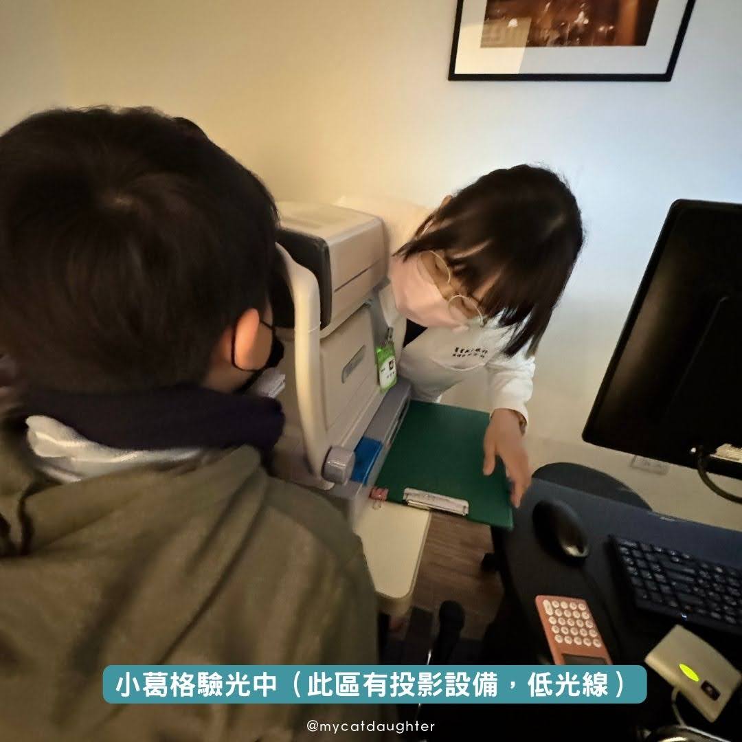 由於小葛格預約的時間比較早,很快就輪到我們檢查視力,眼睛檢查儀器有很多台,視力量測設備一座,驗光師姐姐很有耐心,態度既親切又溫柔,裸視、矯正視力按部就班量測,節奏順暢。