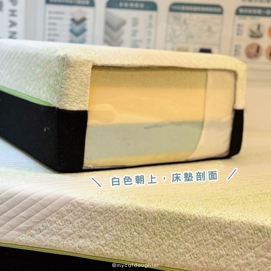 「也太快了吧!」果然有神奇的入睡魔力!我在白色床墊上研究DM才發現,原來這兩張床墊是同一張!雙面躺感適壓床墊好睡嗎?床墊主要有六層結構,從最底層依序是:魔粒綿40D、高支撐泡綿25D、Q彈綿40D、魔粒綿40D、內防水織布布套、冰絲涼感科技布套,所有的結構加起來是25.4公分,是「最剛好的床墊高度」,難怪我們躺下去覺得記憶床墊對於身體的支撐力很棒,並且非常舒適。