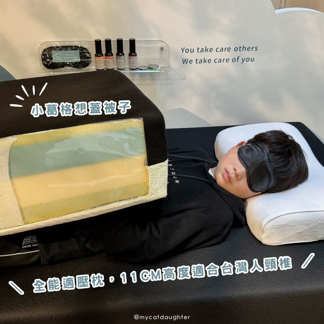 好睡象的睡眠體驗不僅是躺床而已,而是整體的睡眠體驗提升,搭配床墊體驗的還有這個「睡睡晚安-全能適壓枕」枕芯精選「二代親水記憶綿」,恆溫特性不會因為溫度影響而改變軟硬度,親膚表面又有物理性防蟎設計加,上人體工學設計做成適合台灣人頸椎11cm高度,又躺在好睡象安穩熟睡床墊上,難怪小葛格睡了20分鐘還沒醒。
