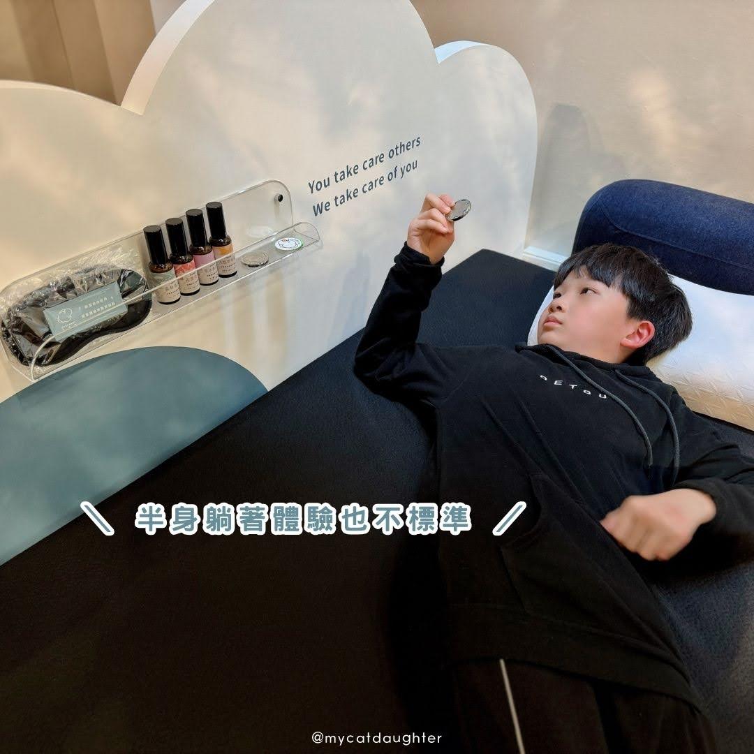 安靜優雅的環境,只用簡單佈置,擺上兩張標準單人床,就好像到民宿check in 讓我們覺得放鬆,床尾巾繡著斗大的字體「神奇入睡魔力,歡迎試躺,用躺的比較準喔!」我問小葛格:「你想先睡哪一張床?」他很自然先往白色床墊趴下去,我鼓勵他整個人上去躺躺看,他又走去黑色的床躺,起初他還有點拘謹,後來就開始在兩張床墊來回走+各種躺。
