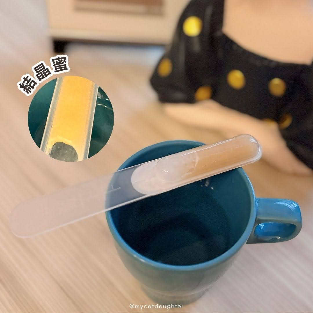 從透明的外包裝就可以看到,每一種口味的蜂蜜型態都不一樣,有深色、有淺色、有結晶體,蜂蜜含有蛋白質、花粉等物質,我用溫水沖泡蜂蜜上層有出現許多泡泡,而且喝起來的口感是香甜帶點微酸,主要是因為純蜂蜜富含有機酸及酵素,每一種蜂蜜的溶解時間不太相同,結晶體的蜂蜜適合用溫水沖泡,需要攪拌比較久。