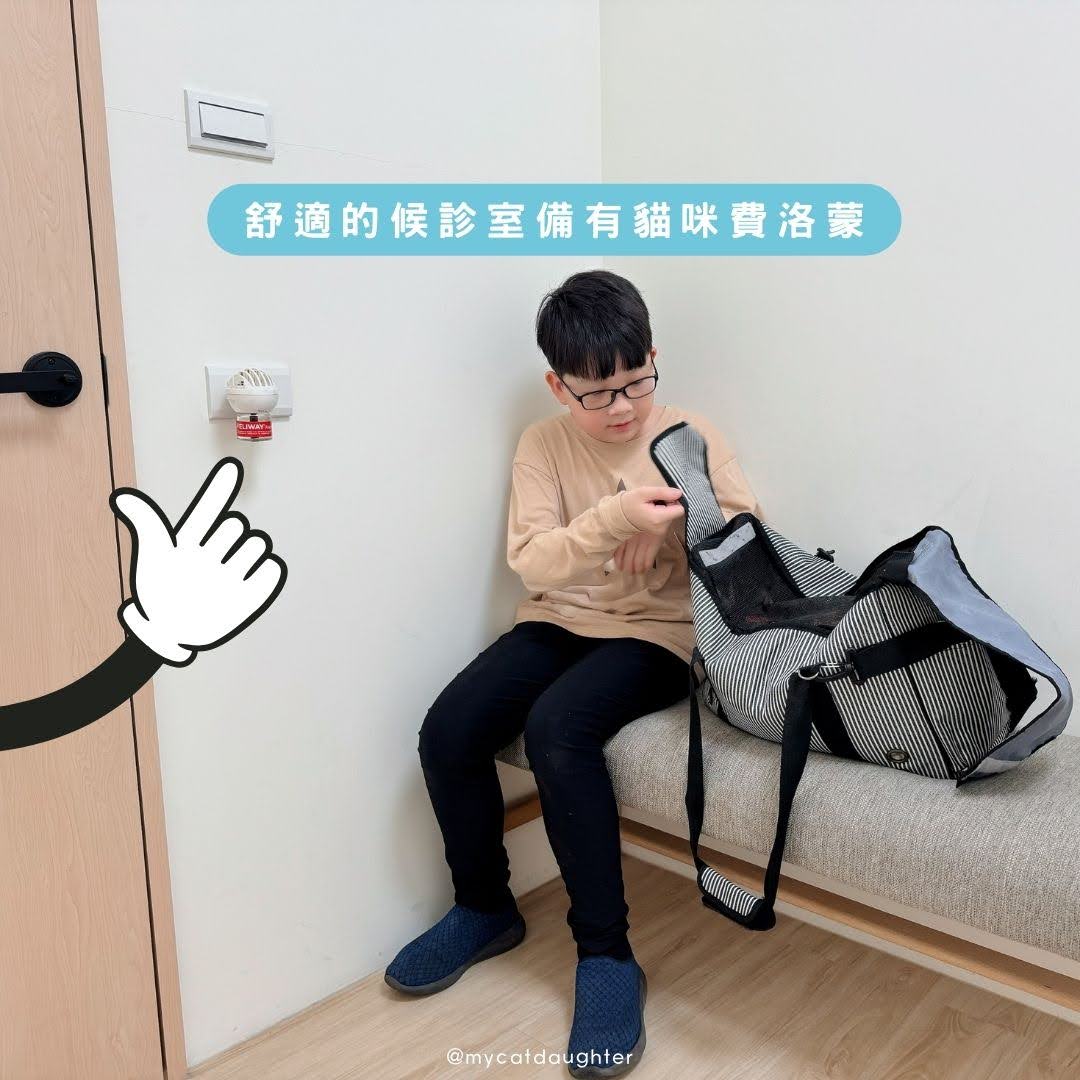 安晴動物醫院貓咪跟狗狗有各別的診間,貓診間外就是貓咪專屬的候診室,是封閉式寬敞空間,裡面安裝貓咪費洛蒙,有助貓咪穩定情緒。