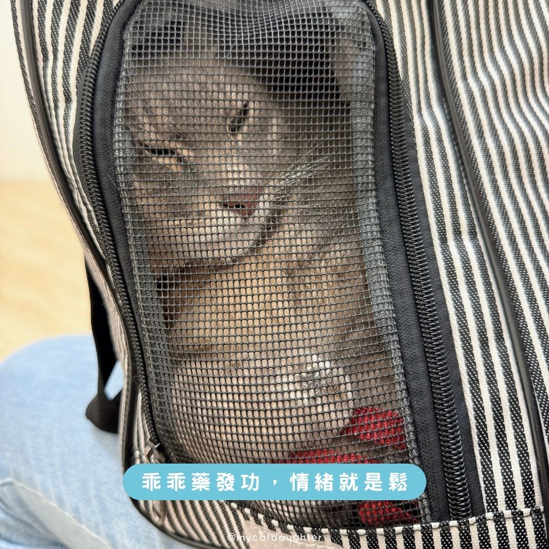 當天幫LuLu套上揹帶,她就兇狠的咬我一口,我想:「完蛋了,如果今天還是生氣就放棄健檢的機會吧!」接著我熟練的餵她吃乖乖藥一秒成功,讓拔拔嘖嘖稱奇,然後我們讓她進入外出背包,連續兩週出門她不爽的情緒全寫在臉上。