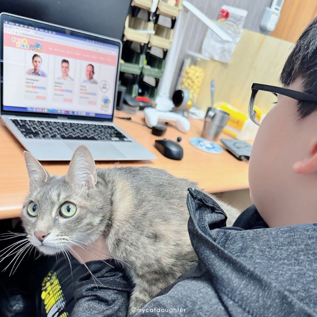 我在一旁觀察,覺得Chris老師的口音非常棒!提問也淺顯易懂,五年級小學生的程度一定可以理解,像是 “Which one do you like more? cats or dogs?” 不過小葛格第一次上一對一課程,可能太緊張了,竟回答 “cakes”,麻麻我差點沒從椅子上跌下來,老師聽到小葛格發音不標準,也會立刻小聲地提醒正確念法,小葛格跟著再唸一次就正確了!