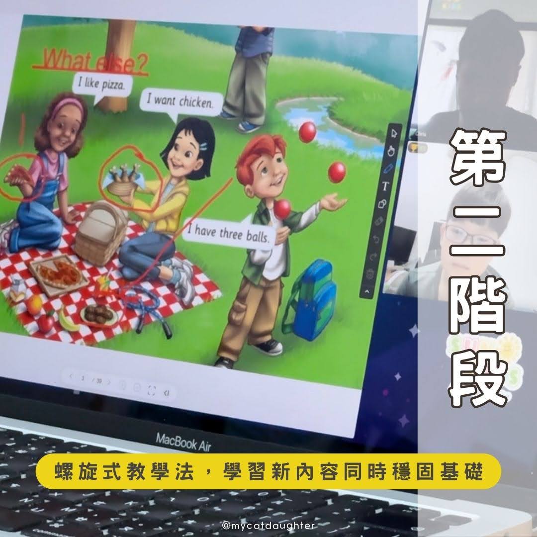 第一張圖片結束,接下來換了難一點的圖片對話,在跟小葛格的對話中Chris老師的用詞也比較難,這就是Sun Kids兒童美語課程的核心理念「螺旋式教學法」(Spiral curriculum),以堆疊的方式在學習新內容同時,反覆練習教過得重點,便可以穩固兒童的美語基礎,基礎一但打穩,就能幫助未來快速理解高難度課程