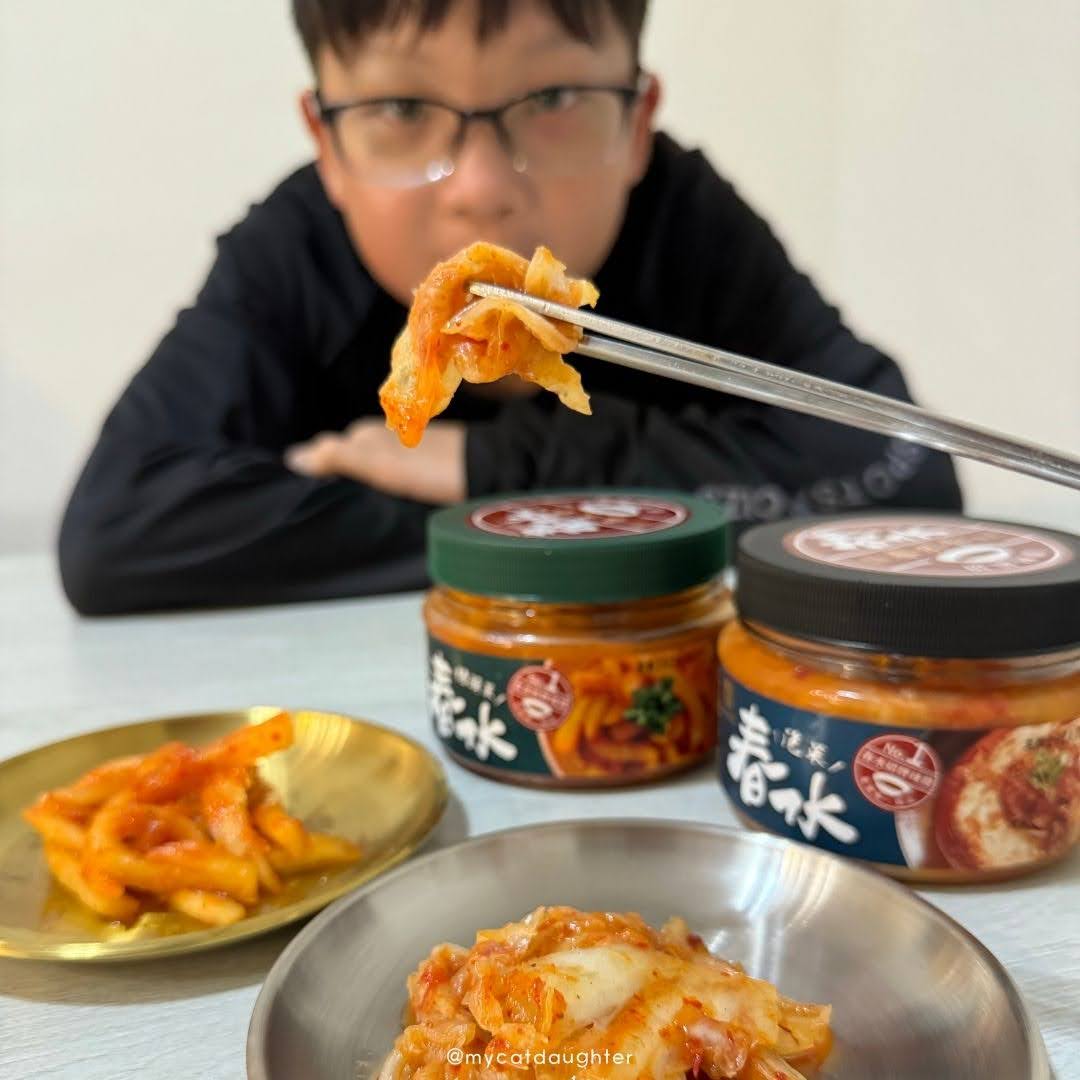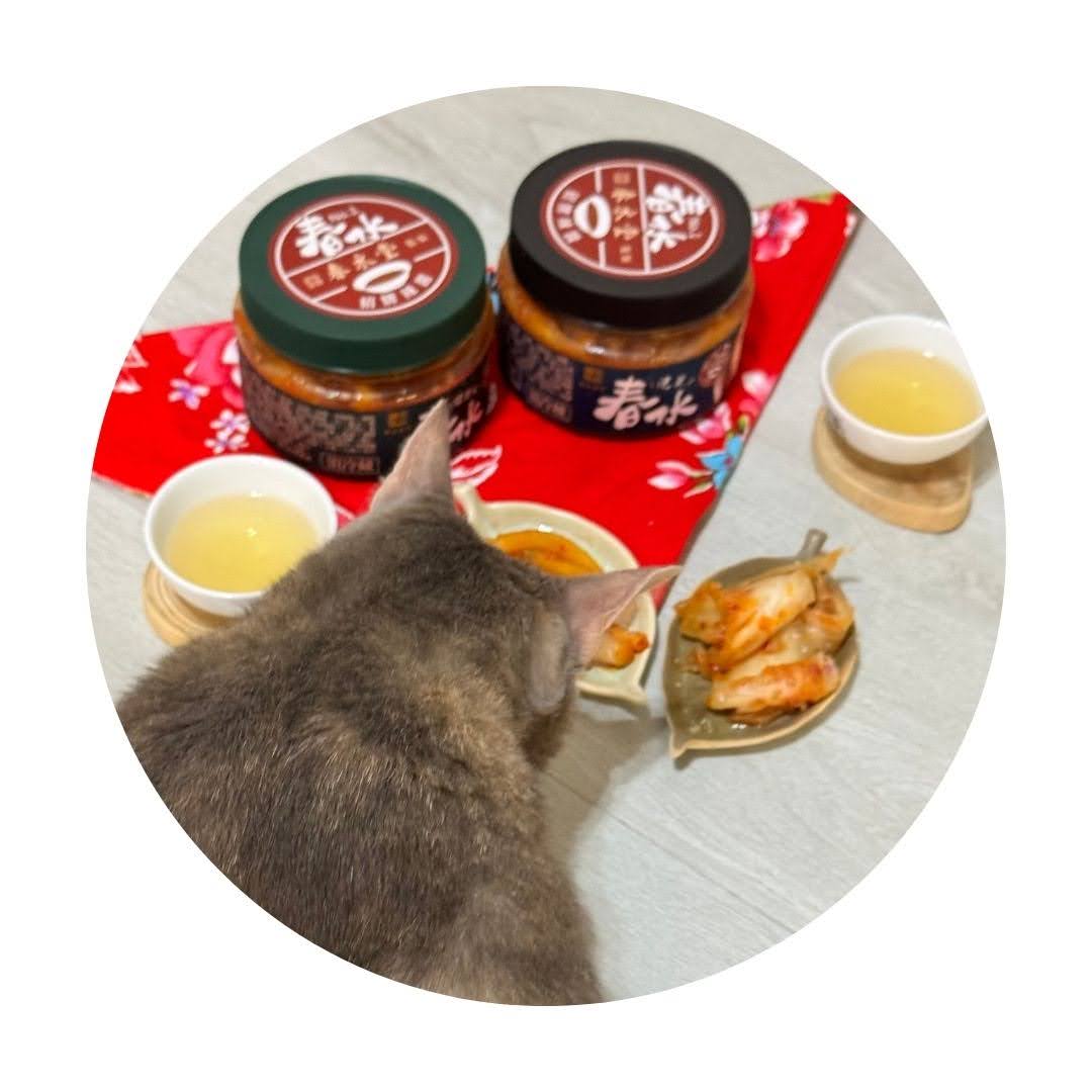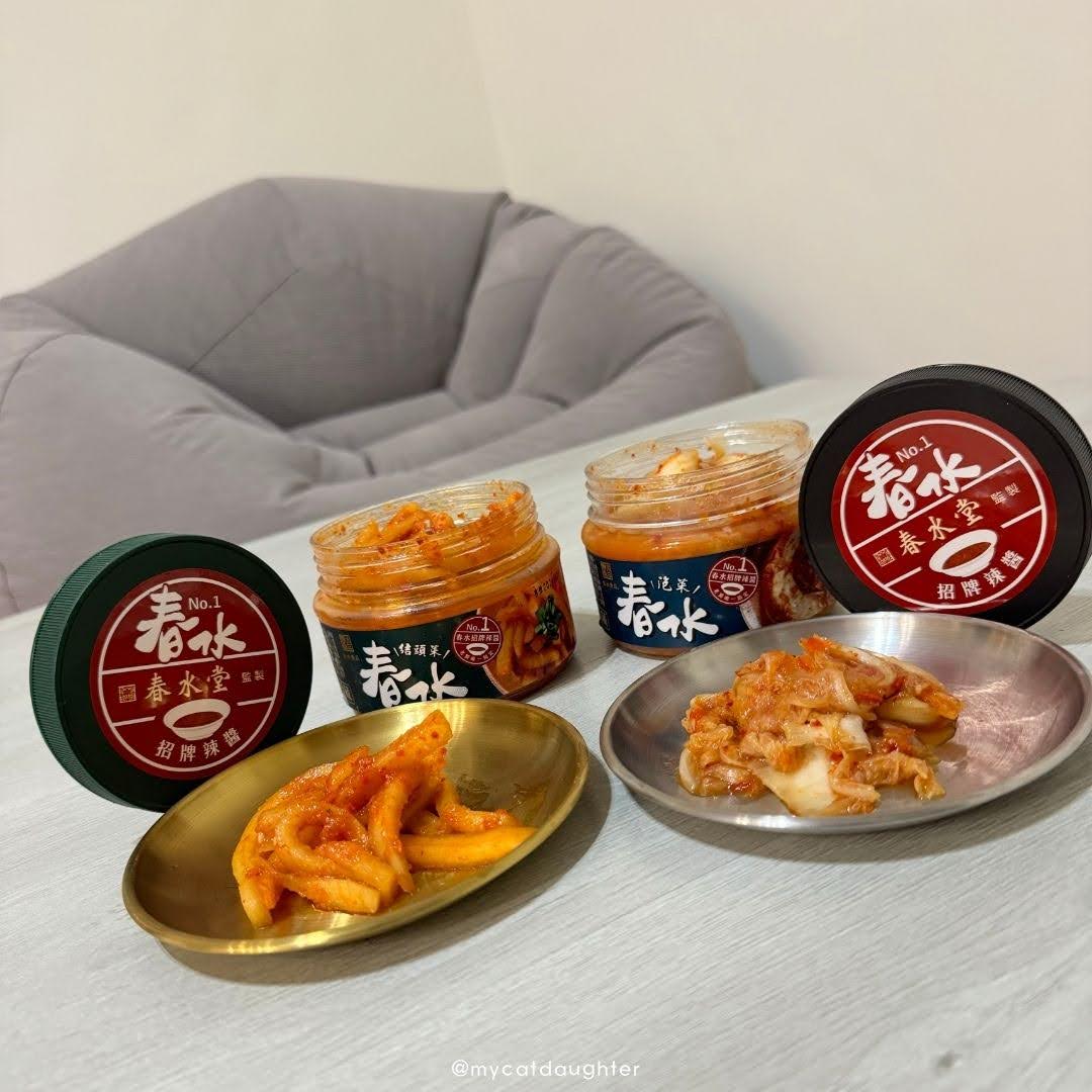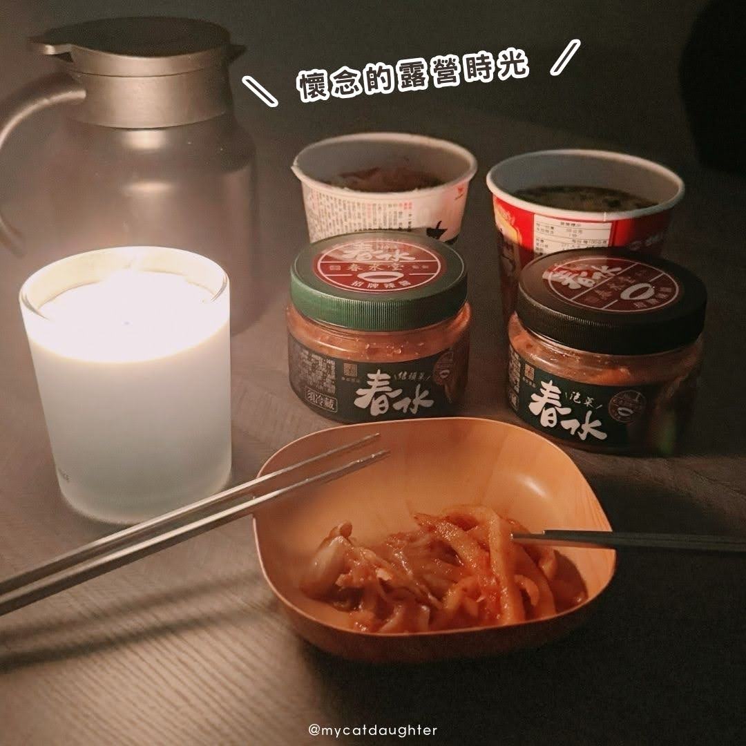 【春水招牌辣醬泡菜】,特選韓國大白菜搭配春水堂招牌辣醬,是韓式厚實蔬菜與台式招牌辣醬靈魂的美妙融合,實在是想加到泡麵裡,讓我想起當年孩子還小,很愛在露營夜裡泡著泡麵,配點泡菜、皮蛋豆腐、喝點啤酒的美好回憶。晚上我備妥泡麵跟泡菜,就把燈關一關,點個蠟燭喊孩子來吃宵夜,兩個男孩為了美味的宵夜陪媽媽玩「儀式感」,LuLu在地上滾來滾去抗議她什麼都不能吃。