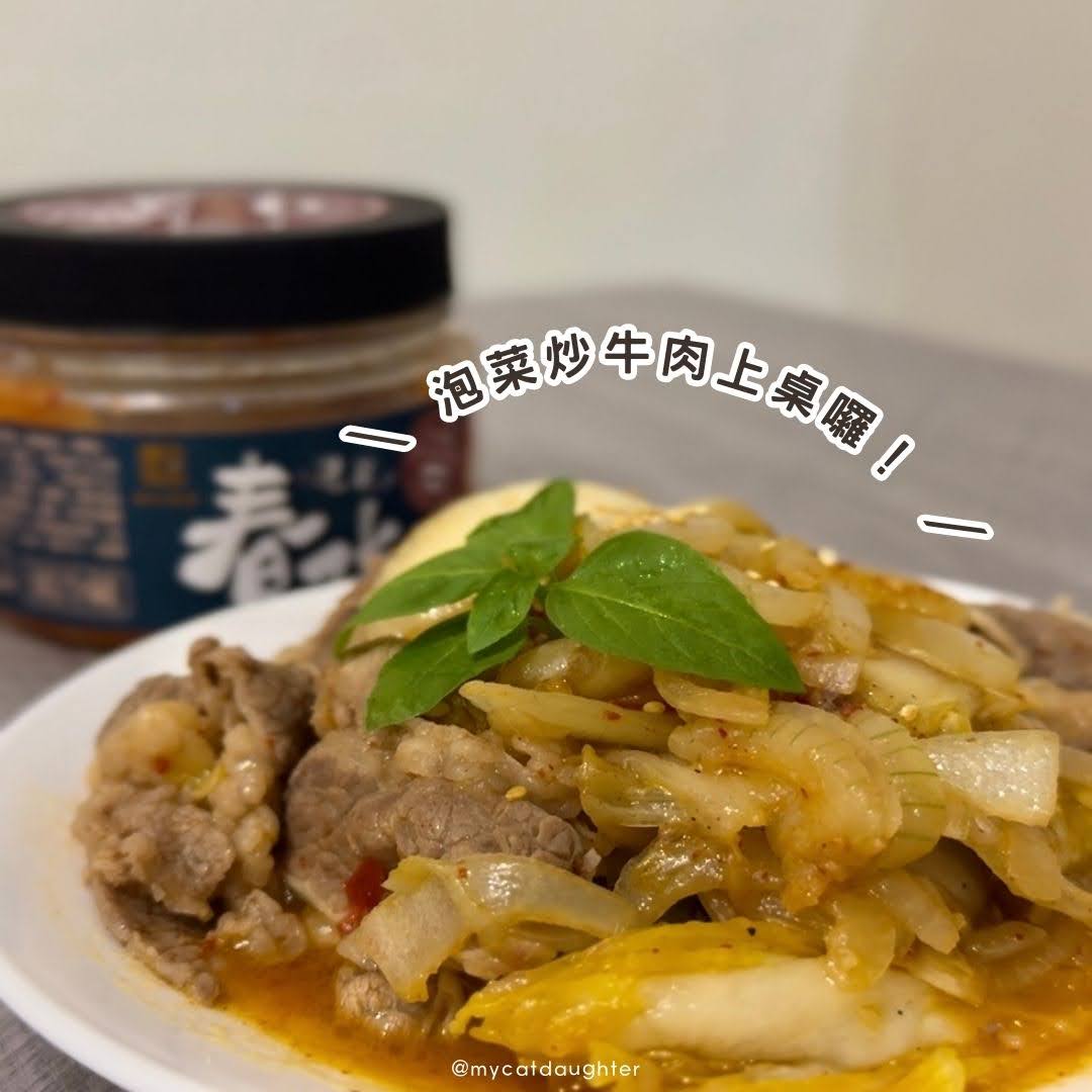 小葛格每天都在念泡菜牛肉,我耳朵都長繭了,那就露一手吧!半顆洋蔥+牛五花肉片150g+【春水招牌辣醬泡菜】及湯汁共100g,熱炒一番,不用再另外加調料,五分鐘即可上桌,麻麻上菜小葛格吃得很開心呢!推薦給需要快速備餐的家長們。