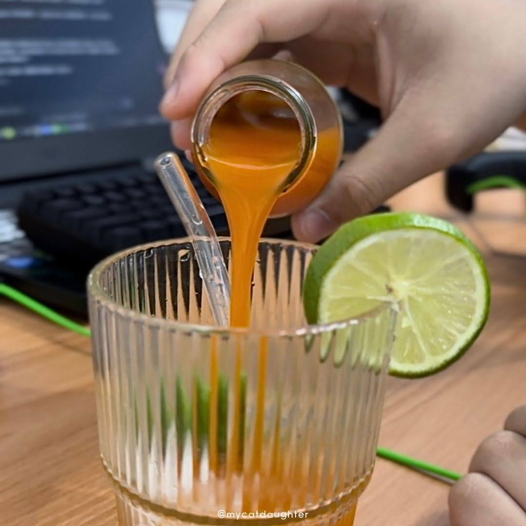 長輩幫我養了一些香草植物在陽台,夏天到了!薄荷、迷迭香、紫蘇都長得特別好,我常常把薄荷搬到室內,用循環扇對著薄荷吹,整個房間都是天然的薄荷香氣,剪幾片葉子沖洗一下、加入新鮮的無籽檸檬、幾顆冰塊,再倒入整瓶木虌果檸檬飲,一杯「聖果蜜多」特調飲就完成了,好有渡假氛圍,長輩從菜園裡耕作回家,我馬上又調了兩杯孝順長輩,清涼解渴又營養,長輩們也很驚艷這樣的美味飲品。