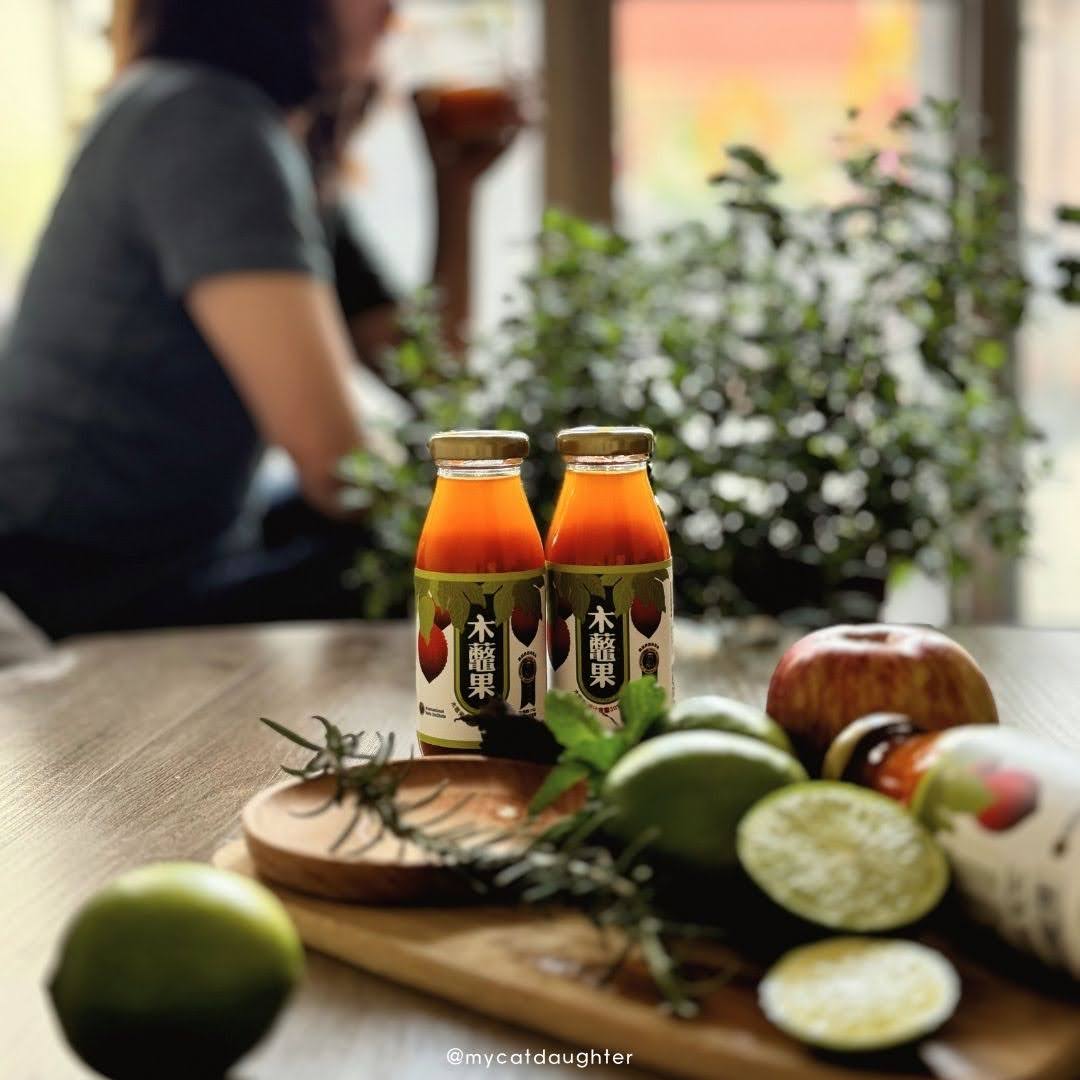 用透明玻璃瓶包裝,非常環保;看得見木虌果的天然原色,使用前先搖一搖,倒出來很像老牌的果菜汁,卻沒有那種複雜的蔬果味,木虌果檸檬飲依稀可聞到淡淡的檸檬香氣。