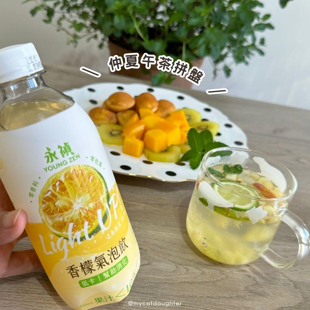 這次採回來的百香果要多放幾天才會甜,因此我這次先不用百香果,選擇一些比較甜的水果來搭配,把蘋果切丁、奇異果切丁、無籽檸檬切片,再倒入永禎香檬氣泡飲,以及少許冰塊,最後點綴放上一片新鮮的薄荷葉,氣泡飲就完成了。