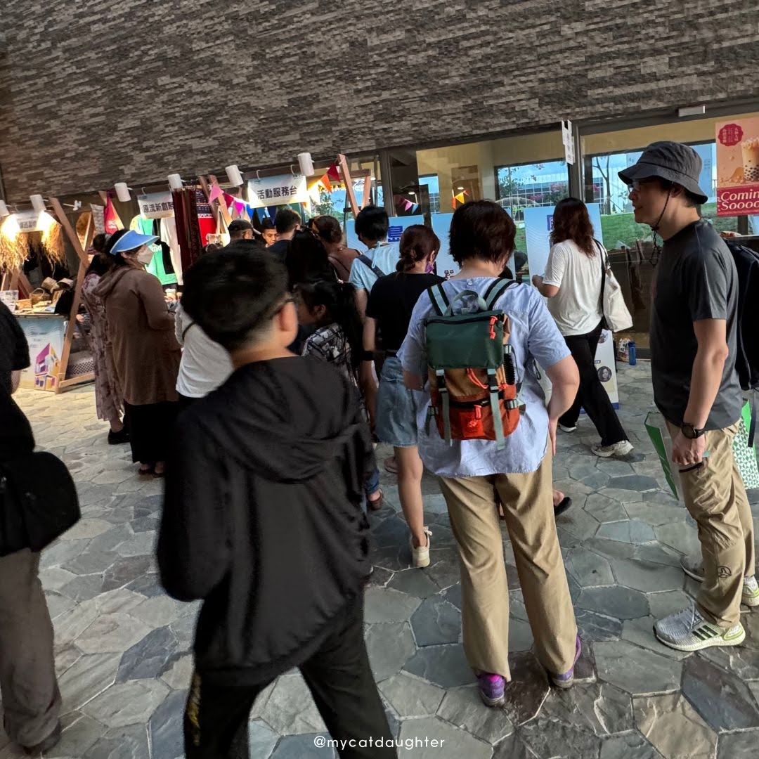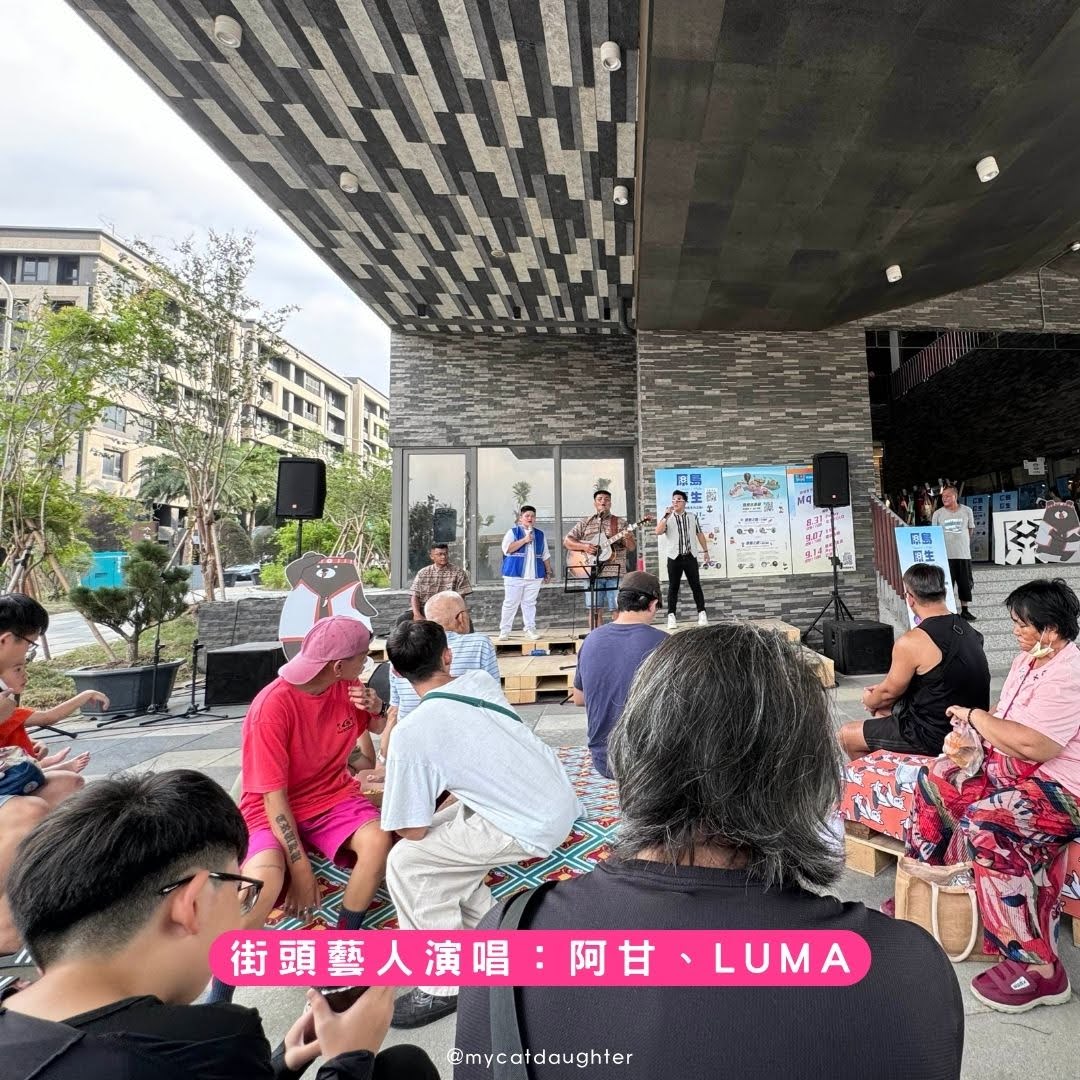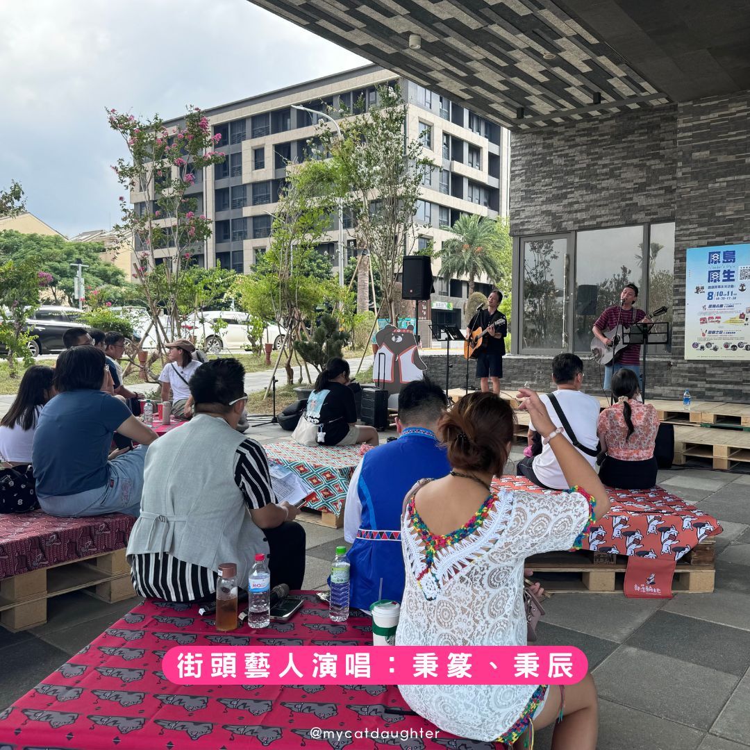 好多商店,我逛回到一樓,從遠方看到吃貨父子倆手上拿著雞蛋仔跟泰式奶茶,坐在廣場聽歌等我,台上演場的街頭藝人是阿甘、LUMA一曲堪稱原住民國歌的「海洋」,果真「原」汁「原」味,這兩人做完DIY了就到這裡吃小吃、喝飲料聽演唱真的很會享受。