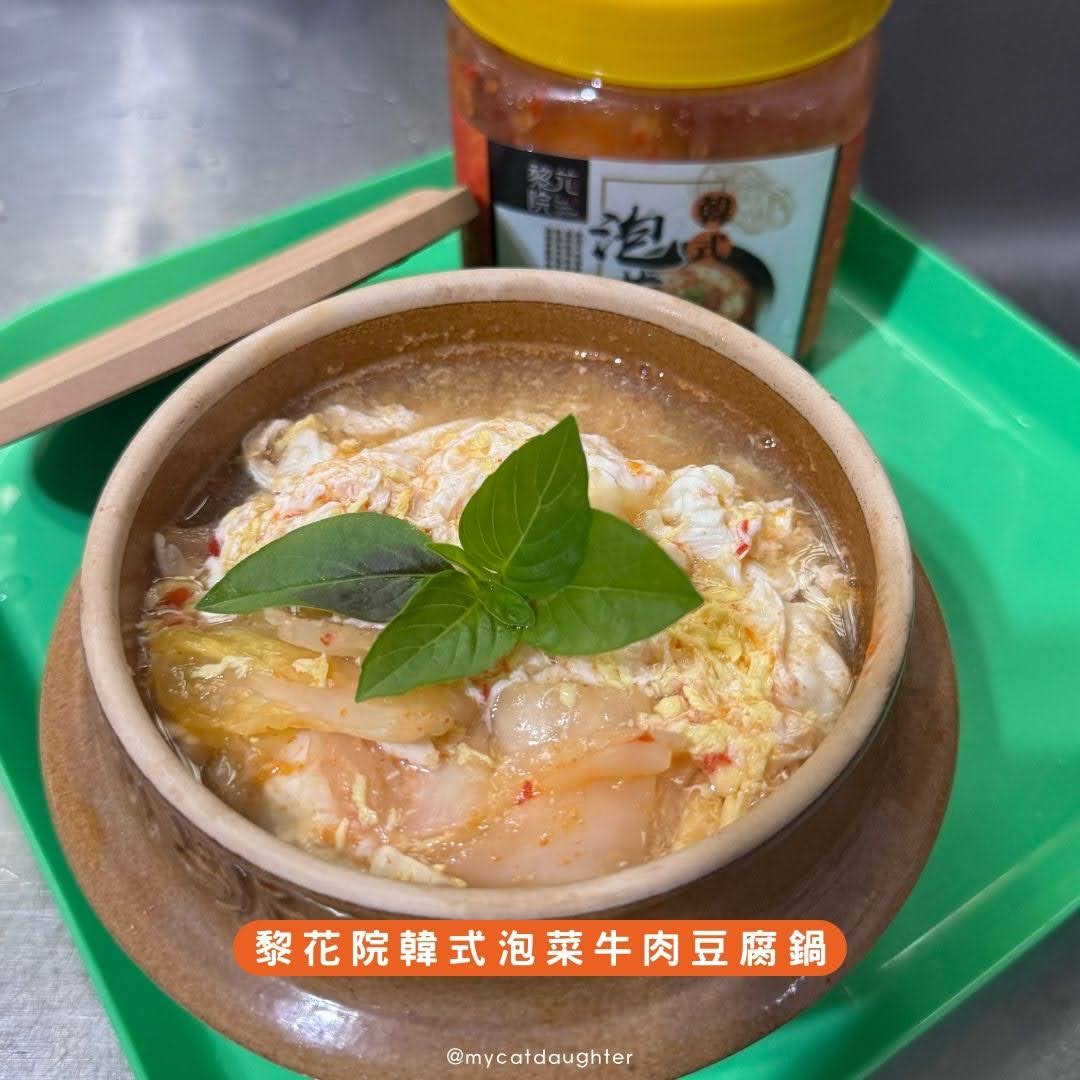 嚴選進口大白菜,使用大量新鮮蒜頭、辣椒,搭配獨家秘製醬汁醃製入味,口感屬於比較熟成的泡菜,配燒肉吃解膩;我更喜歡用這種泡菜煮免開火的低gi豆腐鍋料理,拿出我愛用的插電快煮鍋,年輕時候離家外宿多年,就靠一只插電快煮鍋解決三餐,備好牛五花切片、半盒豆腐、黎花院韓式泡菜連同醬汁少許、蛋一顆、蔥花或九層塔少許,不用再另外加佐料,燉煮一下就是外面餐廳一份賣300元的牛肉泡菜豆腐鍋啦!