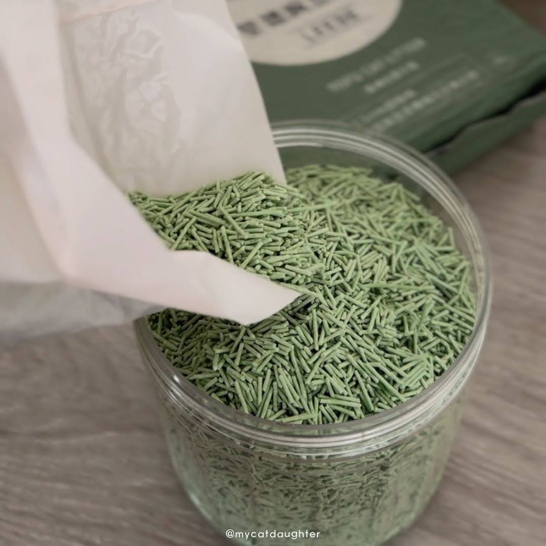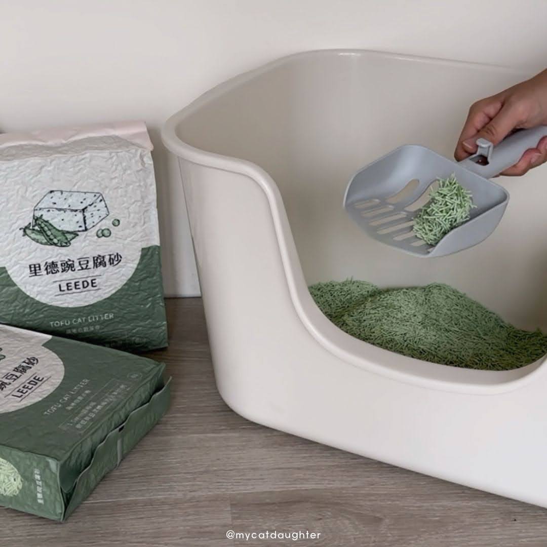洗乾淨的白色貓砂盆,倒入天然植感綠的里德豌豆腐砂,有著小清新的視覺享受。