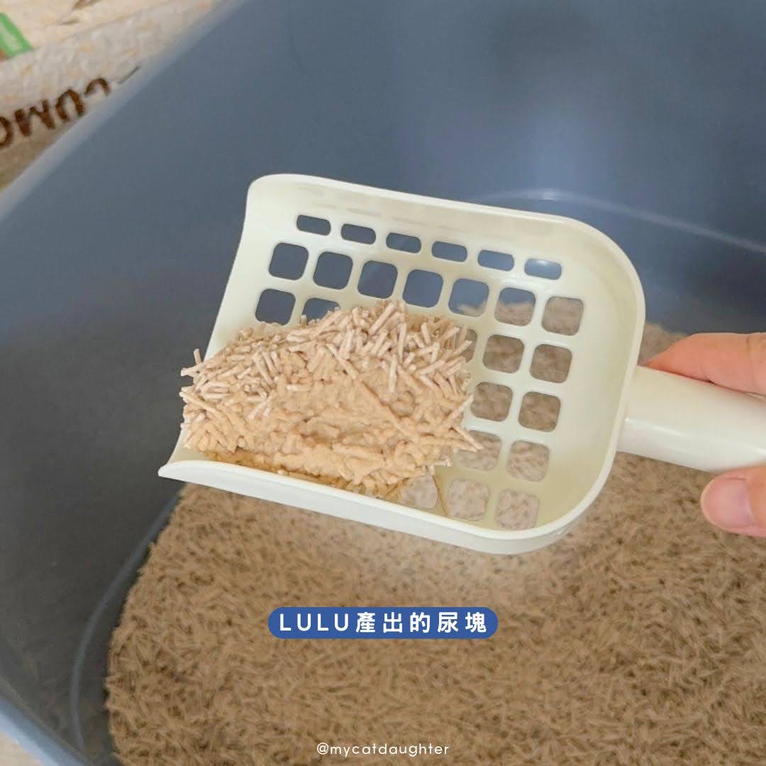 我即刻去檢查尿塊,她尿在貓砂稀少不夠厚的地方,導致尿塊沉在盆底凝結,有些微黏底的現象,不過天然稻穀纖維的Q彈特性,就算有尿塊有黏底現象,也是容易清潔剷除。