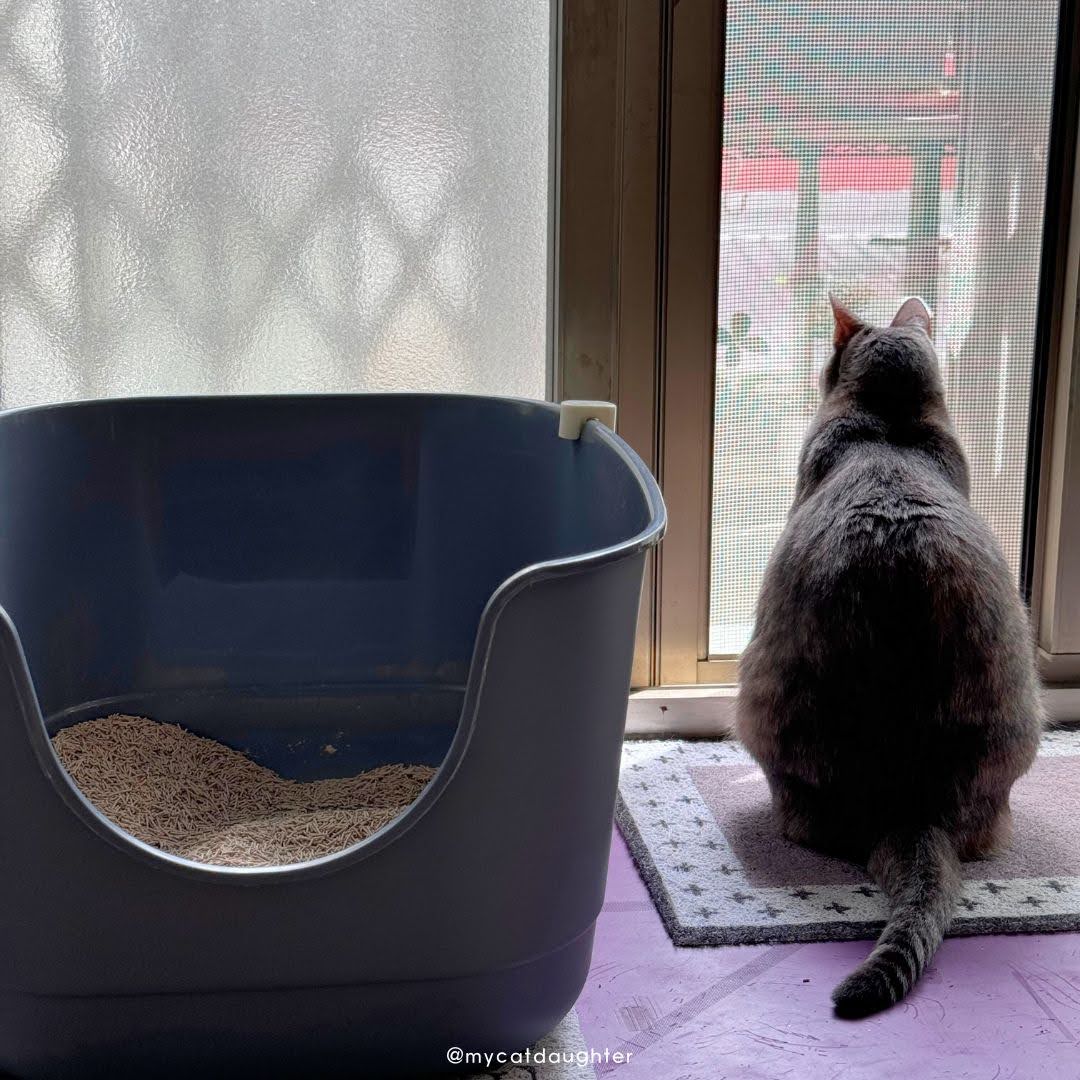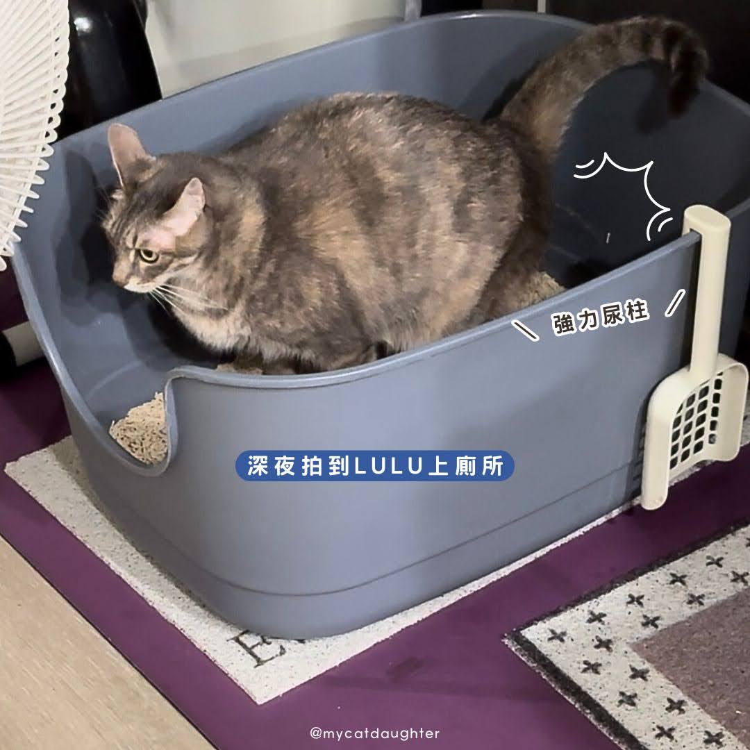 巨大砂盆只放一包砂有點太少,貓砂盆裡的貓砂最好有5-7cm厚度才是舒適的廁所,但是我想測試一下穀魔力貓砂的除臭能力,這幾天就暫時只用一包,我幾乎每天都有在這個砂盆裡看到腳印跟尿塊,但是我都拍不到她如廁的情況,有一天凌晨我在書房滑手機滑到要睡著,聽見撥砂的聲音,立刻從臥榻坐起來用手機偷拍,她強而有力的尿柱沖擊貓砂盆,從邊上順流而下,發現我在偷拍尿完隨便蓋一蓋又聞一聞就飛奔出去,好險1.5mm的極細貓砂沒有被胖貓帶出來很多。