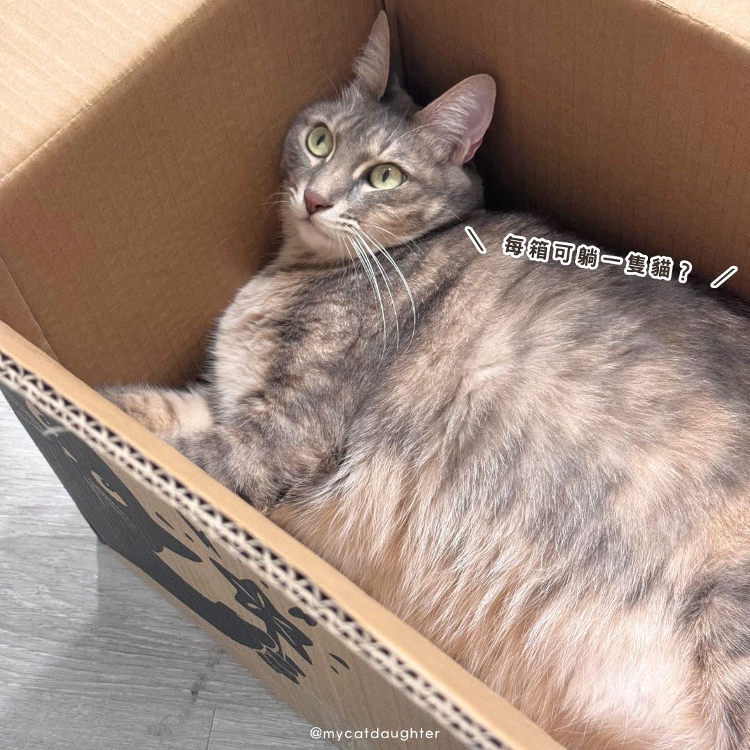 LuLu覬覦這個紙箱,我細看紙箱上有隻可愛的黑貓,旁邊還有四格漫畫,把貓砂都取出後,她立馬跳進去霸佔紙箱。