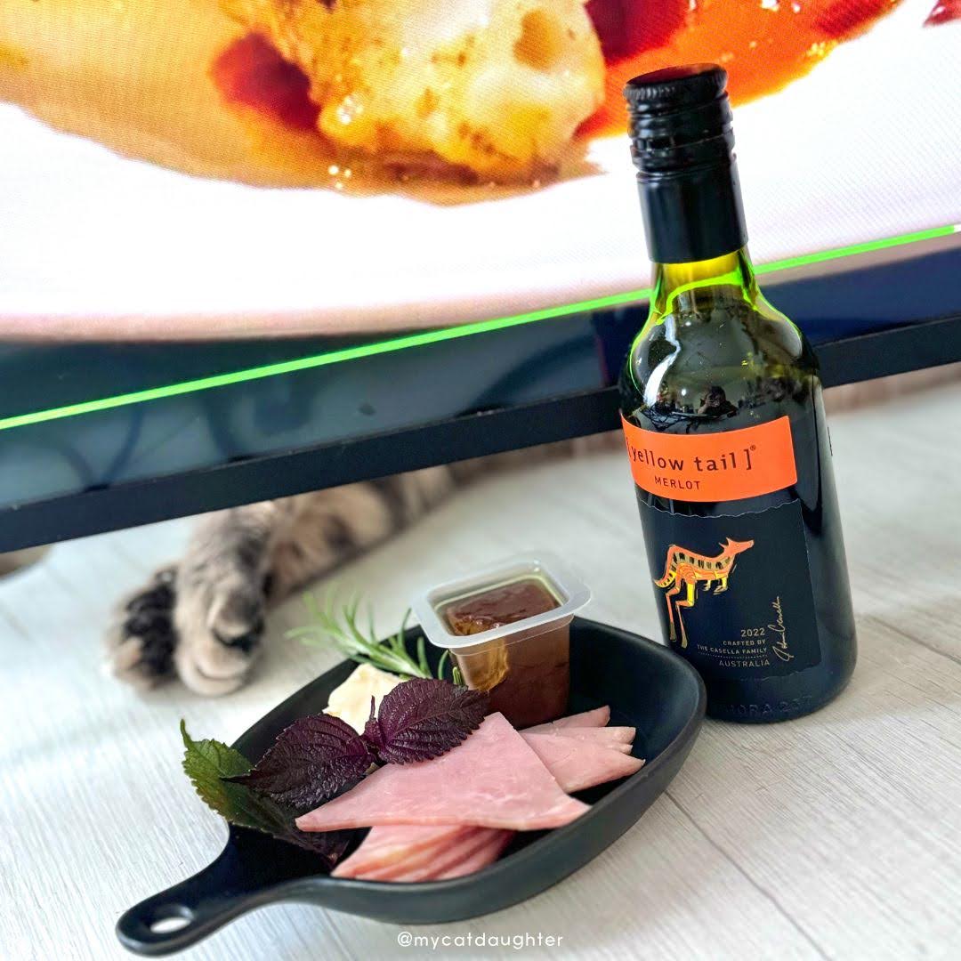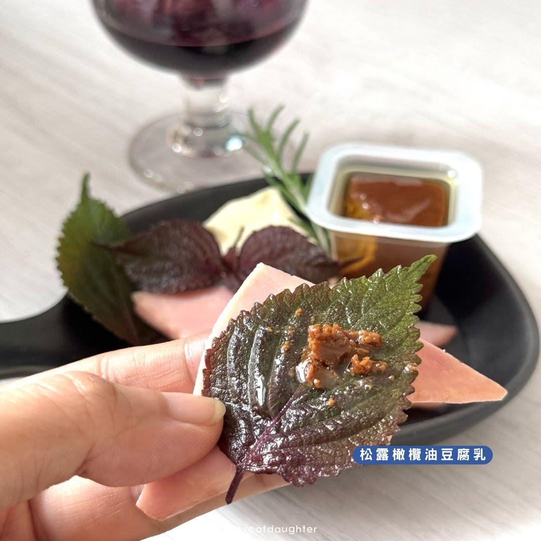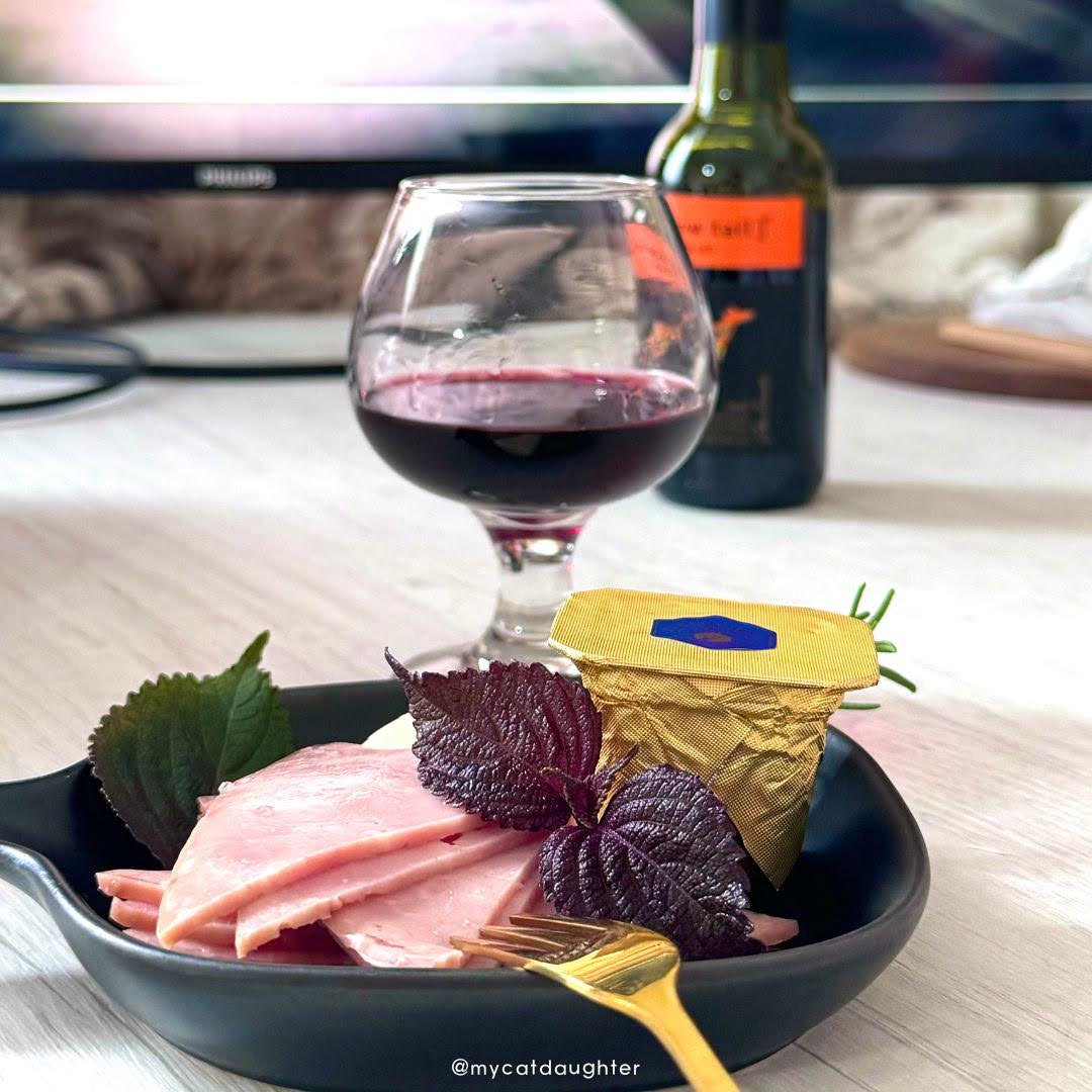 中午不想吃沙拉,來個高蛋白質愉快饗宴,朋友說紫蘇加火腿很好吃,那我再加上絲滑綿密,層次多元的松露橄欖油豆腐乳以及三角起司,佐餐飲料是澳洲紅酒,百搭無國界!打開最近超夯的節目「黑白大廚」,吃著「紫蘇露橄欖油豆腐乳火腿」我覺得自己也很厲害,根本就是「黑白來」大廚。