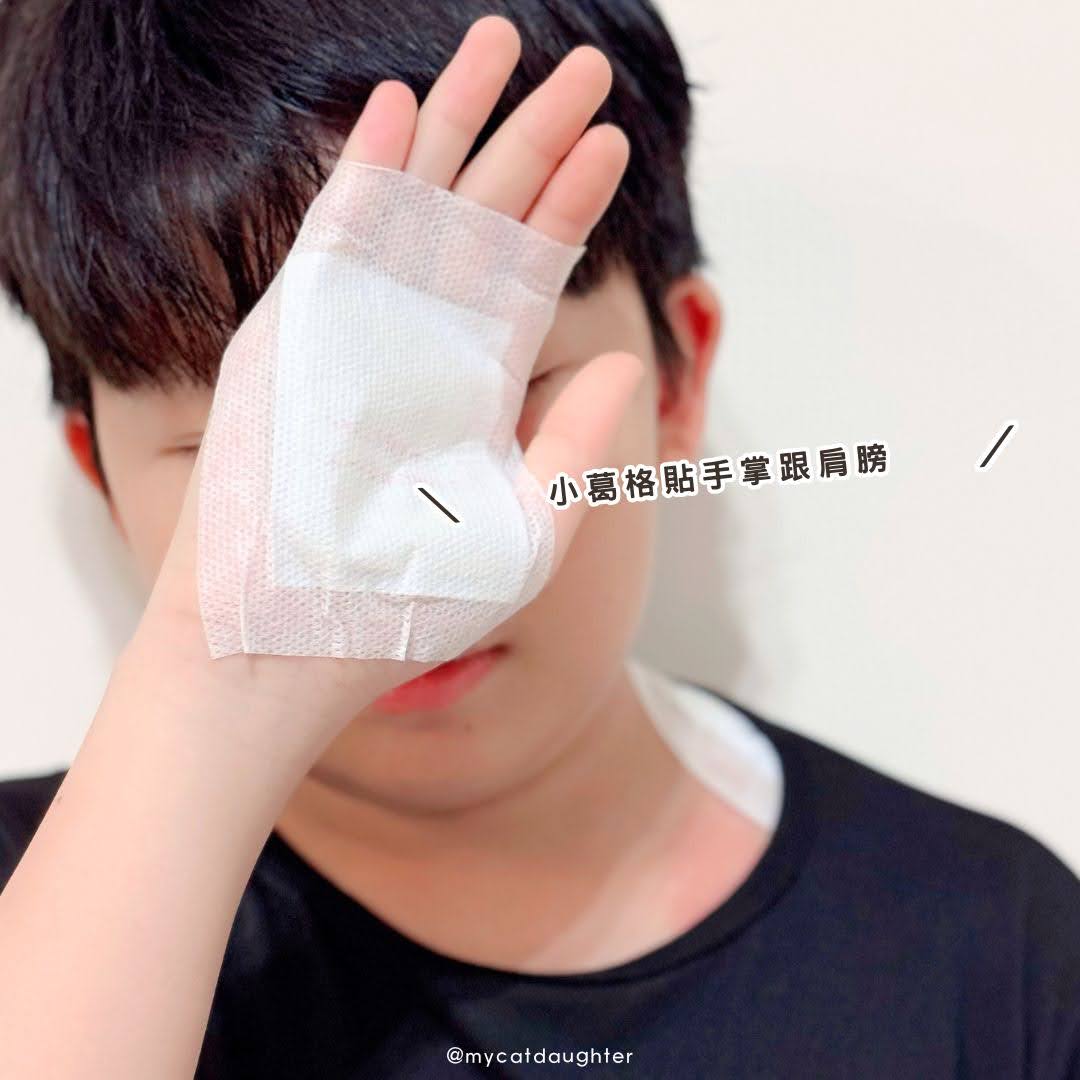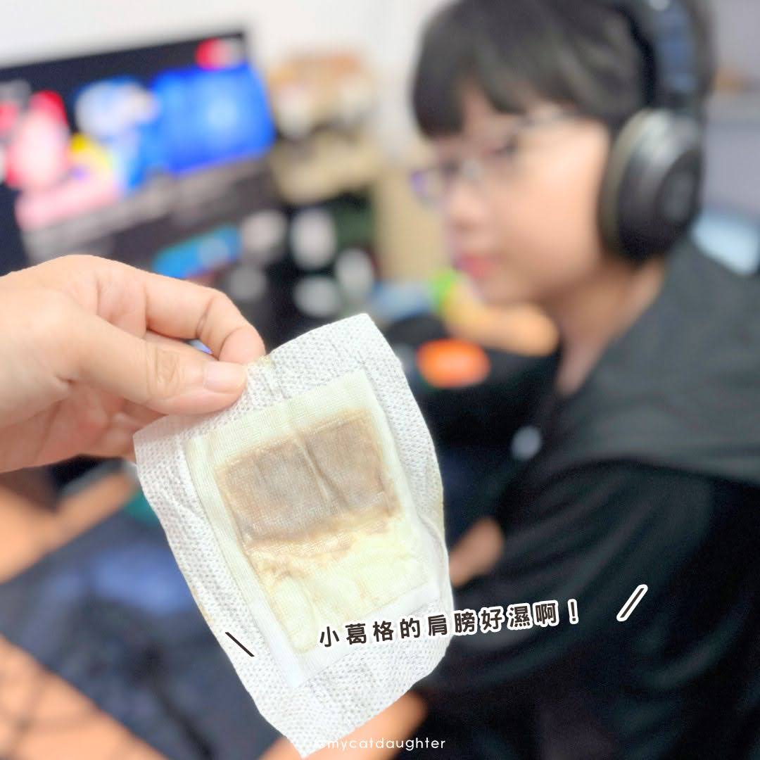 隔天看小葛格的成果,他也是個「濕人」啊!手掌、肩膀都好濕;我自己也貼了一片肩頸,都沒他那麼濕;果然每個人體質不同,濕氣存在的部位也不同,改天也來貼貼看腰跟大腿試試「成果」。