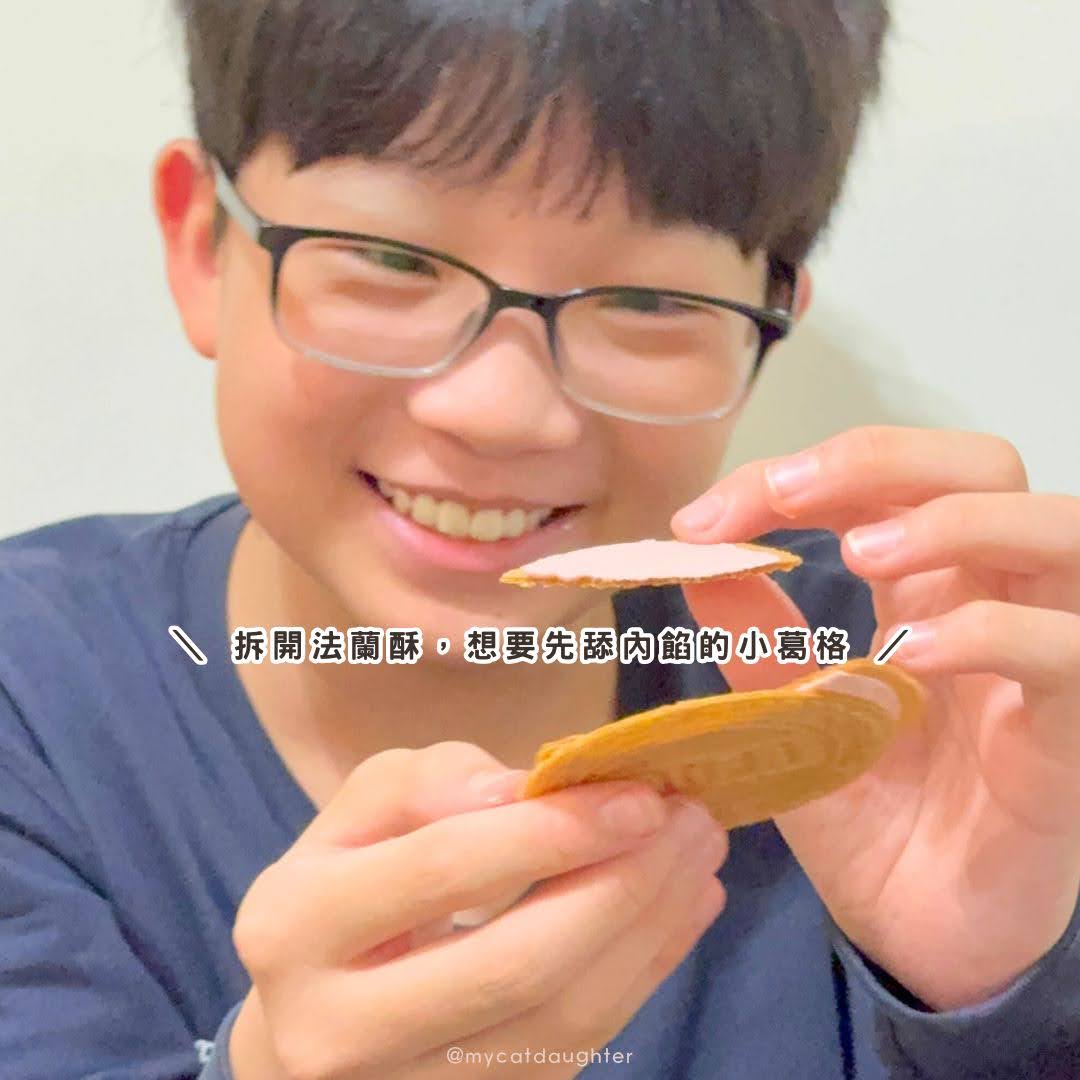 迷你法蘭酥有三種口味唷!香草風味、草莓風味、可可風味,許久沒吃到日本神戶風月堂的小葛格:「好高級的口味。」