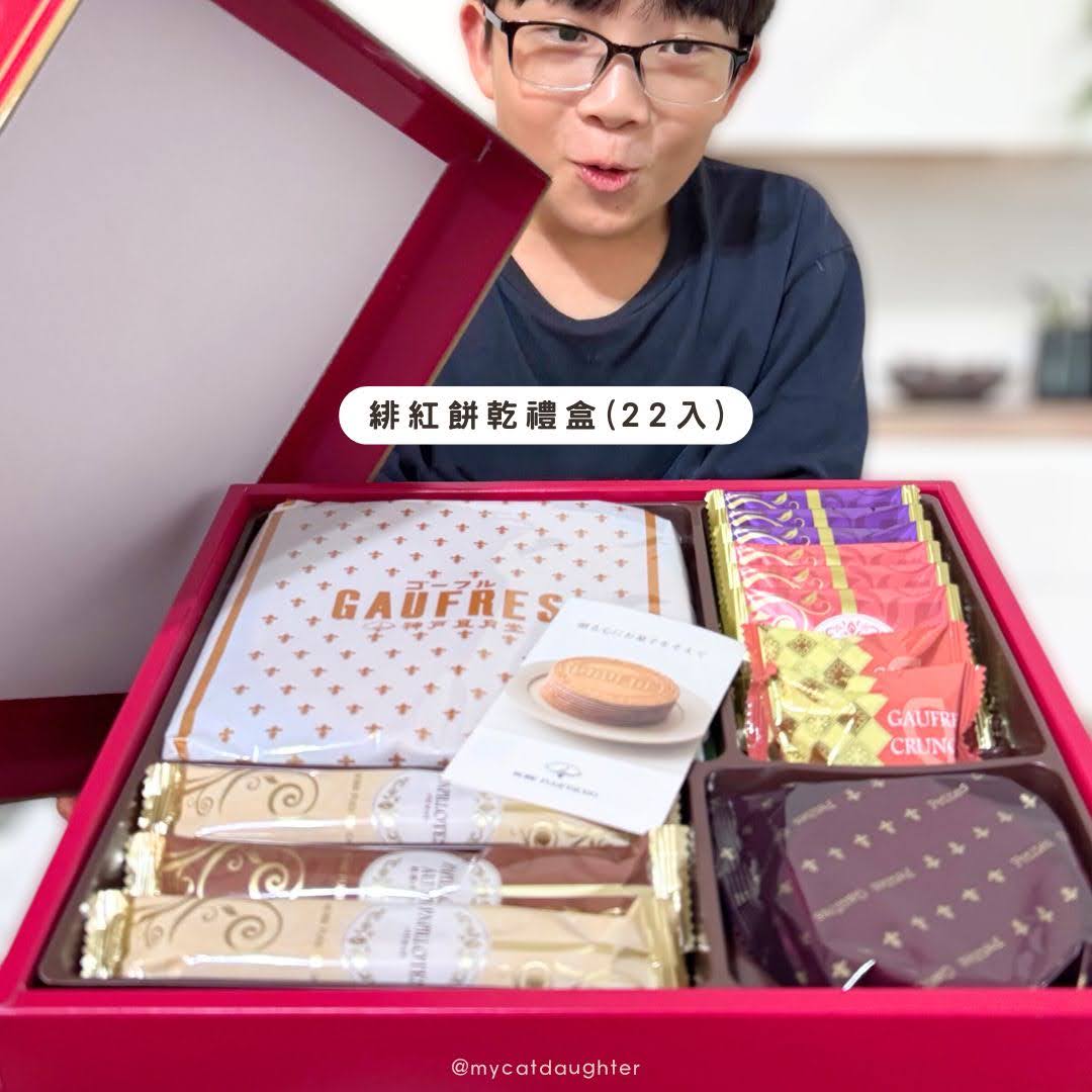 有百年歷史的神戶風月堂,除了法蘭酥以外,還有許多種類的精緻餅乾,像這個 #緋紅餅乾禮盒 ,紅色燙金的禮盒包裝,緋紅餅乾禮盒(22入)內容物為兩大類點心: