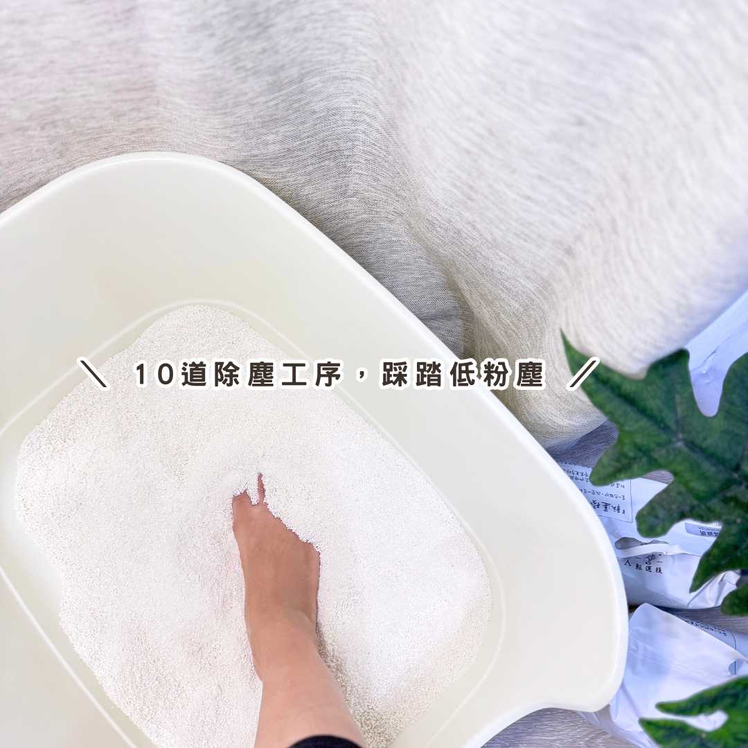 因為 LuLu 已經變成小胖妹,加上家裡用的是開放式貓砂盆,我很久沒讓她用非條型的砂了,這款《頂級純木薯貓砂》到底踩起來像白砂還是珍珠石?ㅤ好奇心爆棚的麻麻,真的用腳去踩了一下,不愧是經過10道除塵工序,踩踏起來果真低粉塵也不會像礦砂一樣揚塵。