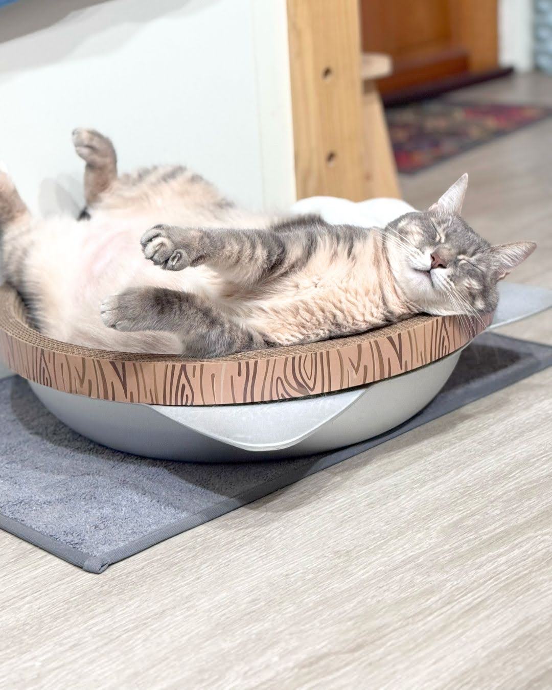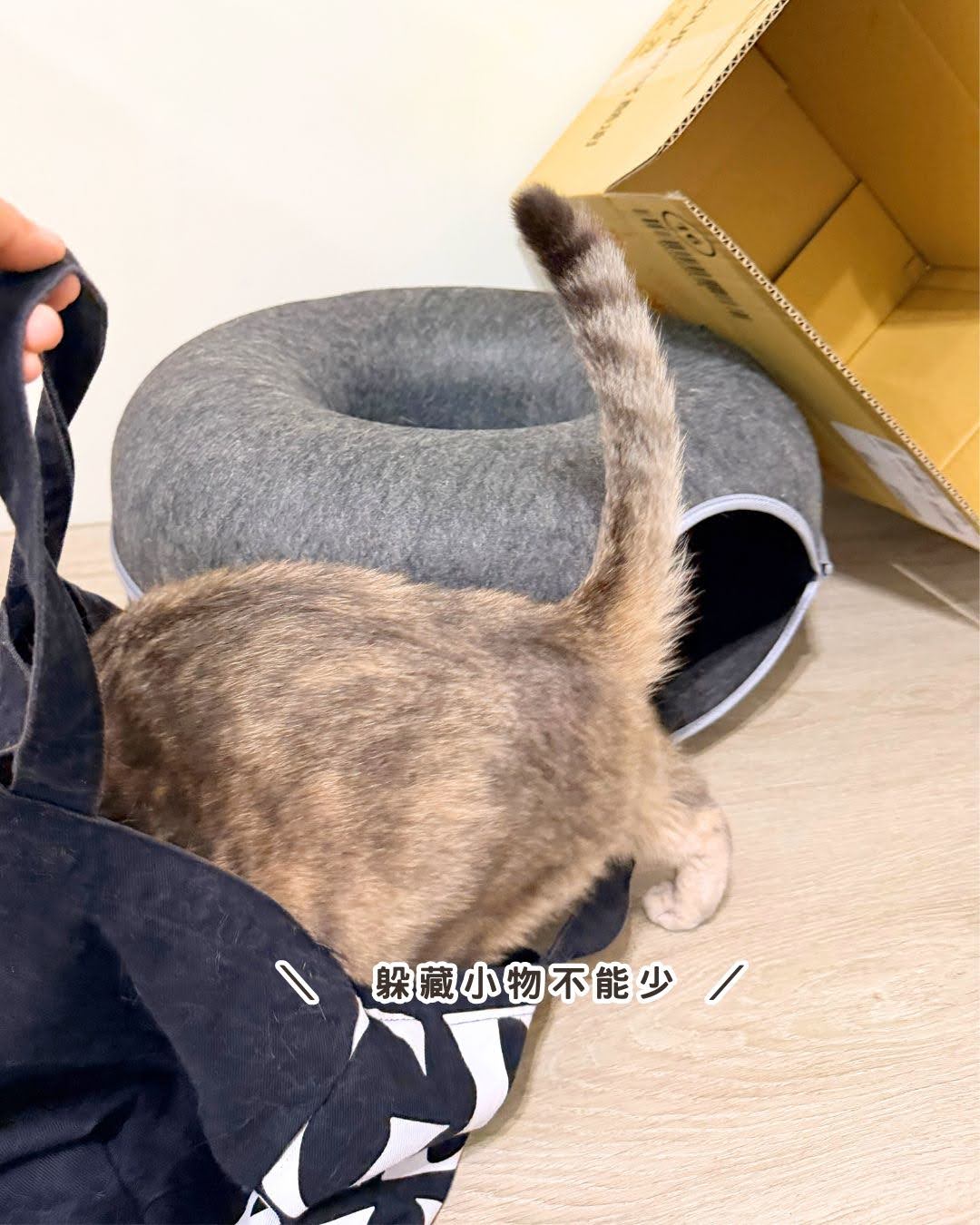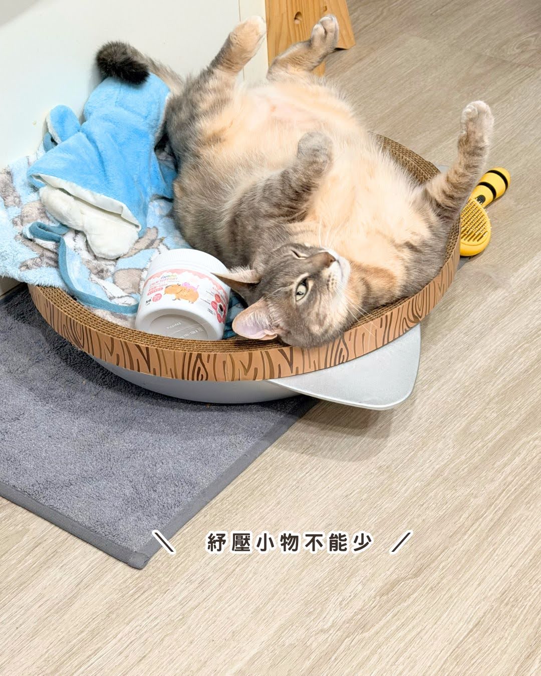 因為擔心她情緒過滿引發癲癇,我在家裡準備了多個抓盆、抓板,還有紙箱和隧道,讓她能消耗體力、找地方安定心情;有時也會搭配舒緩噴霧幫助放鬆。